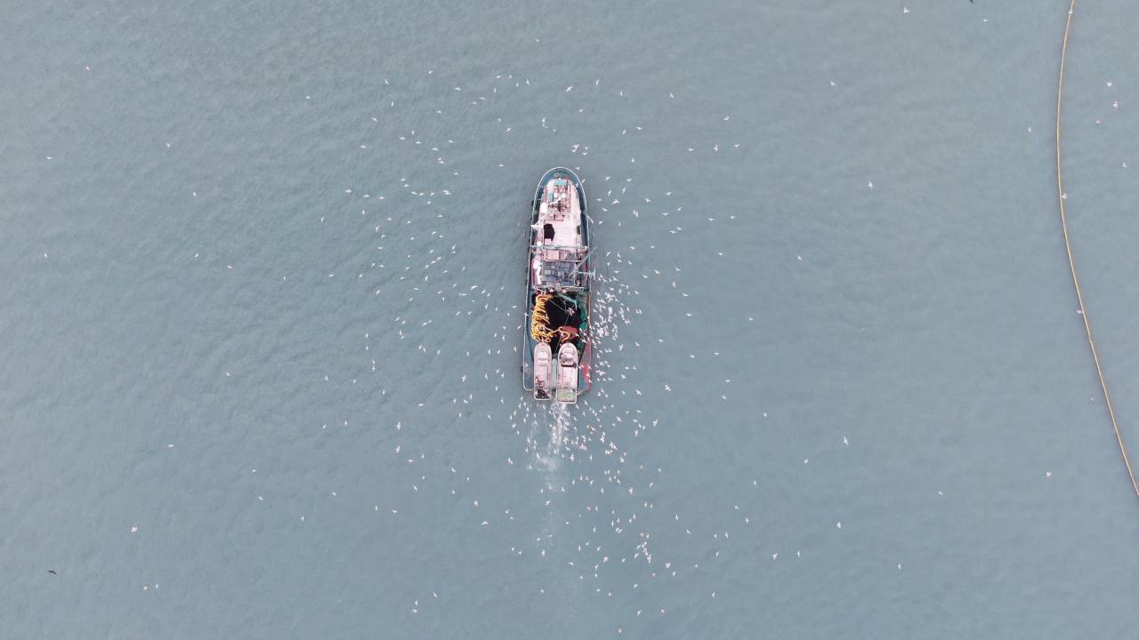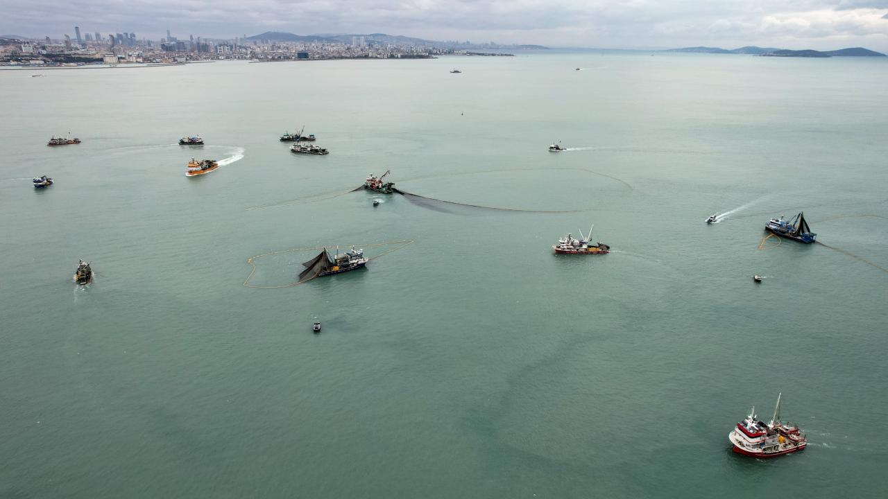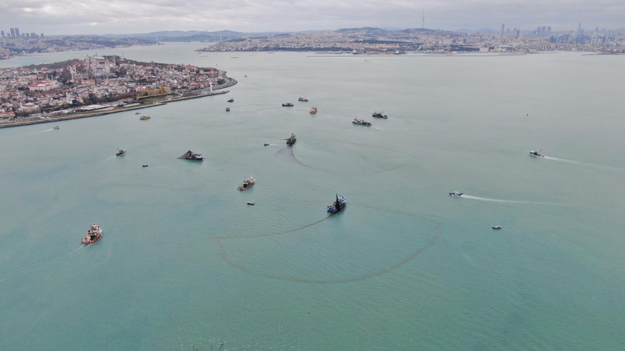 İstanbul’da soğuk hava ve fırtınaya rağmen çalışan balıkçıların zorlu kış mesaisi havadan görüntülendi, Kumkapı açıklarında onlarca balıkçı teknesi bir araya gelerek balık sürülerini yakalamaya çalıştı.