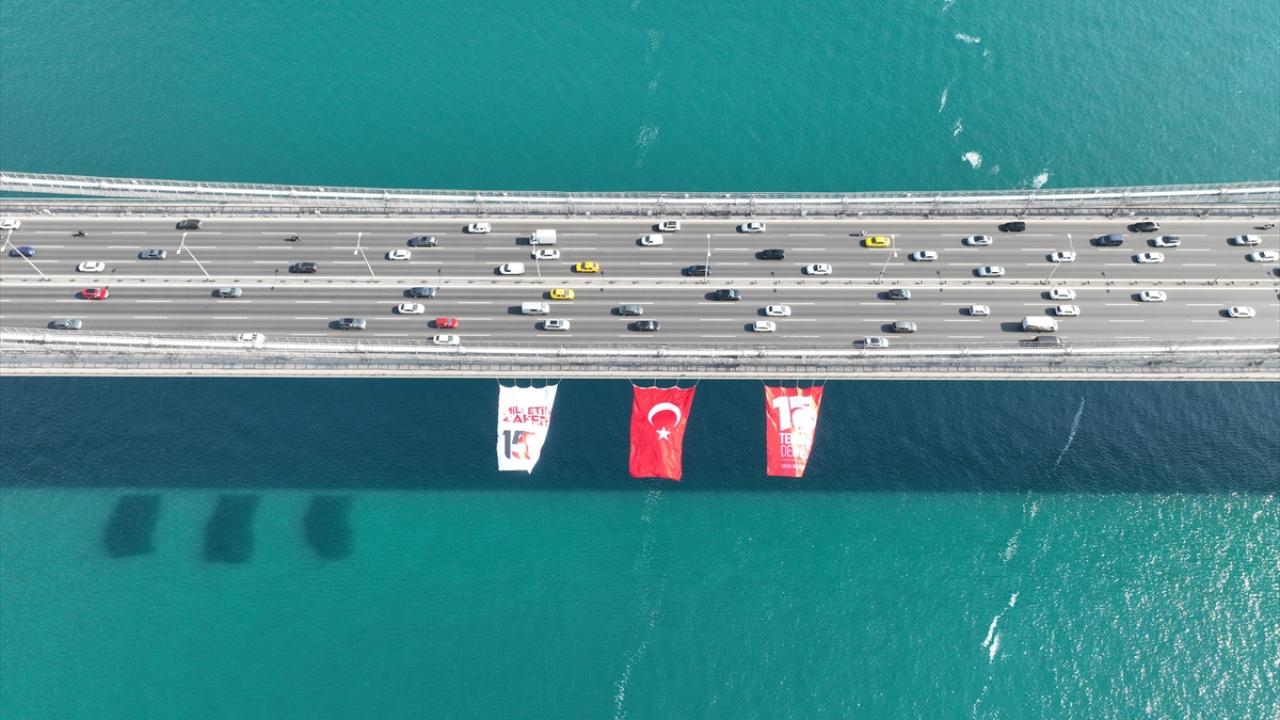 Öte yandan köprülere asılan Türk bayraklarının yanına 15 Temmuz Derneği bayrağı ile "Milletin Zaferi" yazılı bayraklar da asıldı.