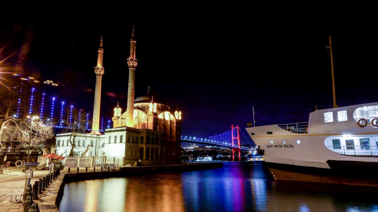 İstanbul'da Ortaköy Camii ve 15 Temmuz Şehitler Köprüsü'nün ışıklarının denize yansıması güzel görüntü oluşturdu.