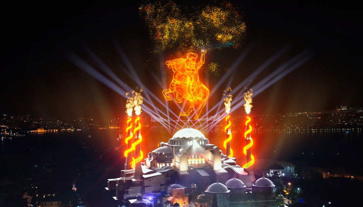 İstanbul`un fethinin 568. yıl dönümü, Cumhurbaşkanlığı İletişim Başkanlığınca Kültür ve Turizm Bakanlığı iş birliğinde gerçekleştirilen etkinliklerde fethin sembolü Ayasofya-i Kebir Cami-i Şerifi`nin semasına Türkiye`de ilk kez uygulanan gökyüzü video haritalama yöntemiyle fetih görselleri yansıtıldı. (Arşiv-29.05.2021)