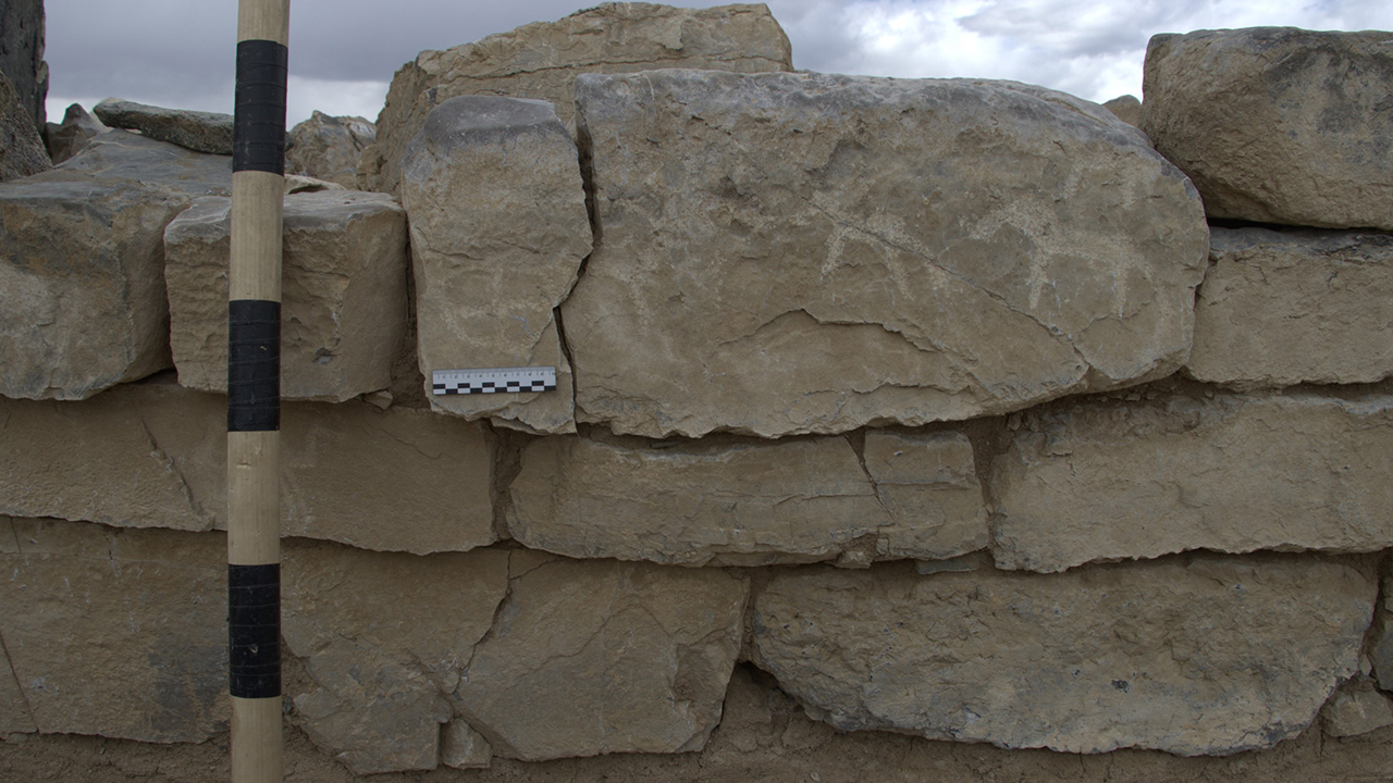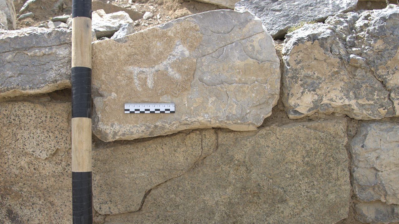 Piramidal yapının giriş sütunlarında tespit edilen 20 resimli kompozisyon arasında iki deve, iki insan, iç yırtıcı hayvan, dört sembolik işaret ve 23 at imgesi yer alıyor.