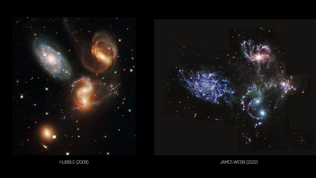 James Webb, dev şok dalgaları ve gelgit kuyrukları gösteren bir galaksi kümesi olan Stephan`s Quintet`in kalın tozunun arasından baktı.