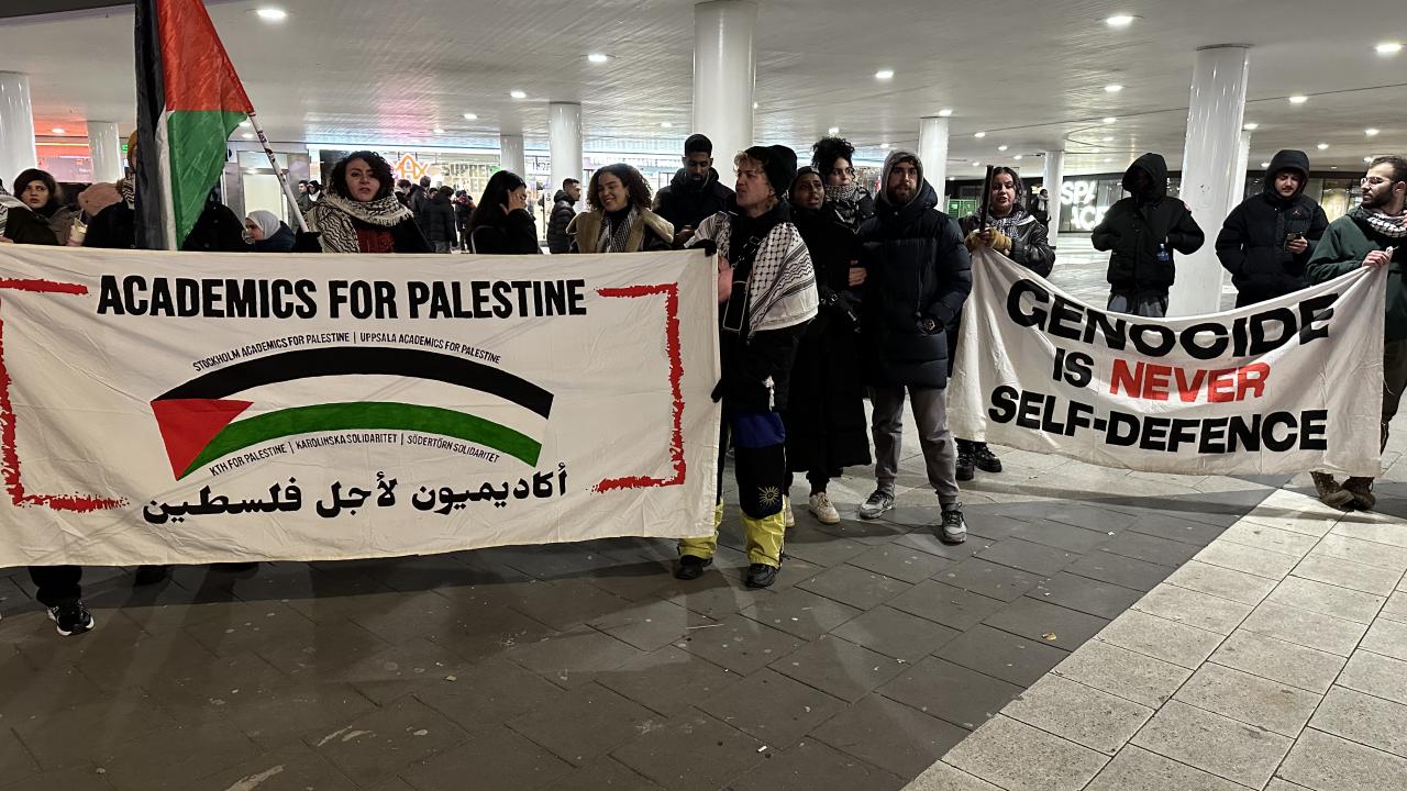 İsveç ve ABD`nin İsrail`e verdiği desteğe tepki gösteren protestocular, iki ülkenin, İsrail`in işlediği savaş suçlarına ortak olduğunu savundu.
