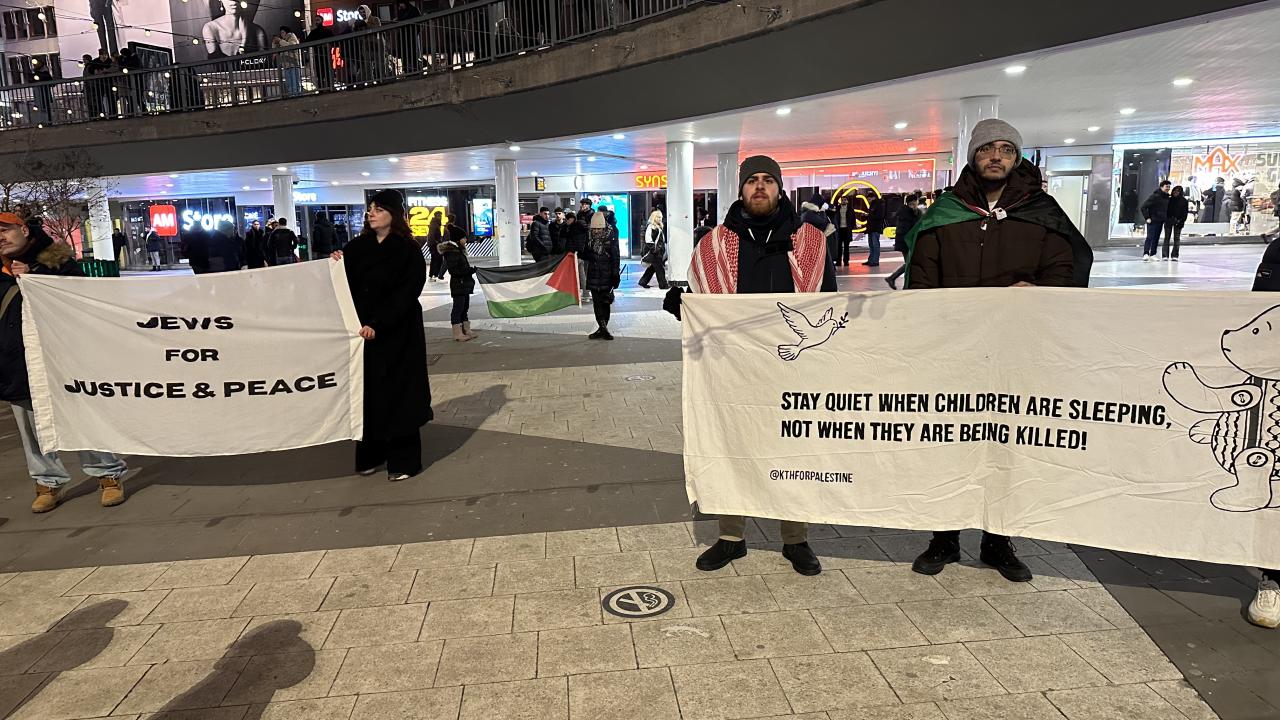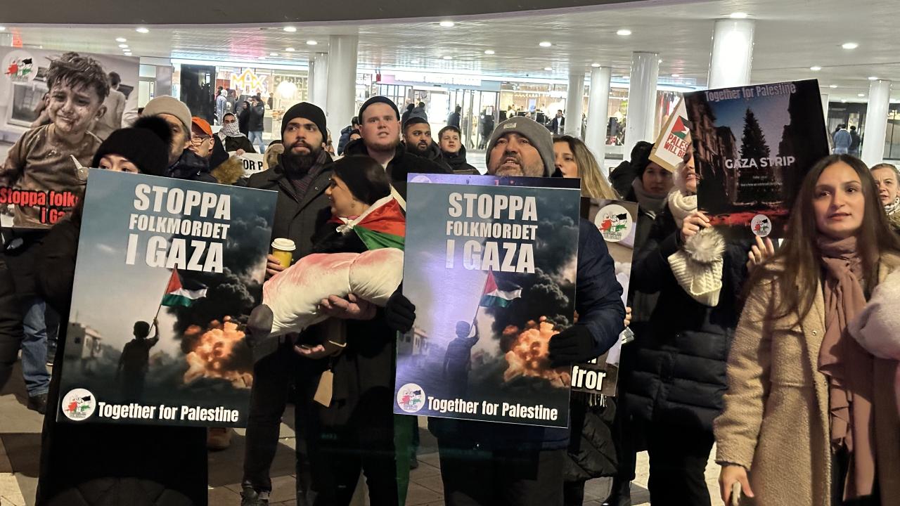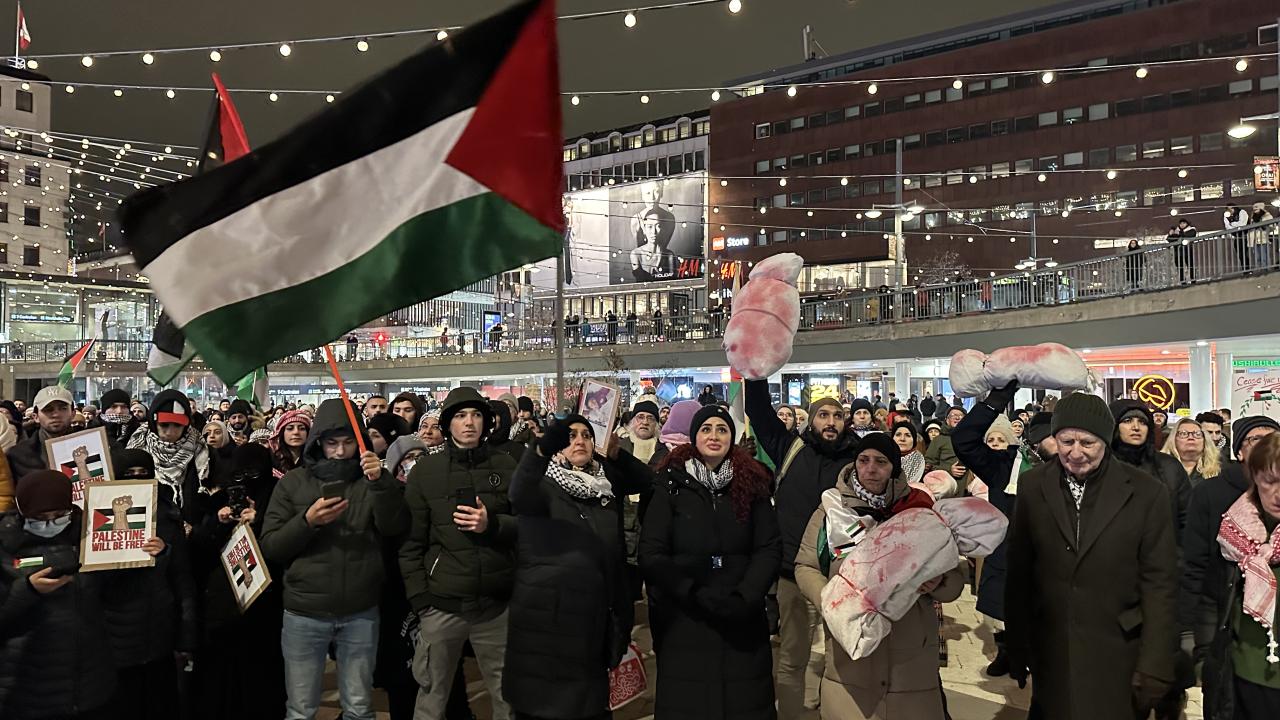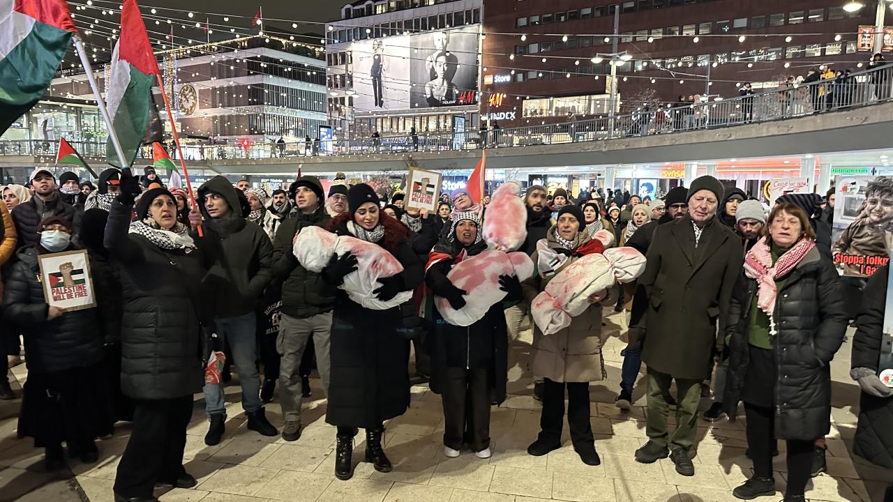 Ülkedeki çok sayıda sivil toplum kuruluşunun çağrısıyla soğuk havaya rağmen Segels Torg Meydanı`nda toplanan göstericiler, yılbaşı kutlamak yerine İsrail tarafından öldürülen çocuk ve sivillerin yasını tuttu.