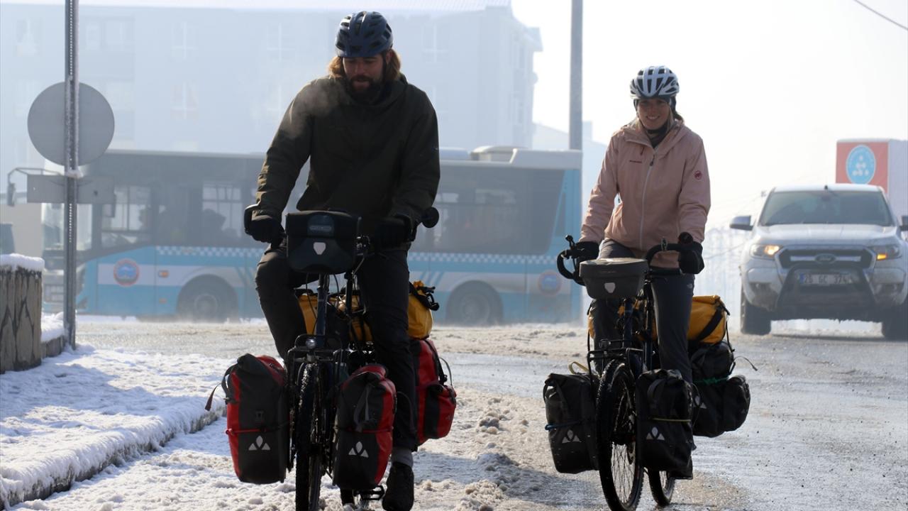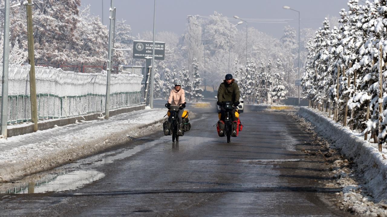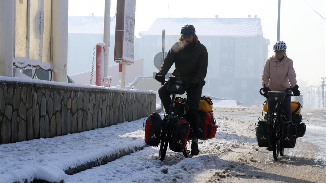 İsviçreli çift, Erzincan ve Erzurum’un zorlu yollarından da bisikletleriyle geçerek Ağrı’ya geldi. Kış mevsiminin çetin geçtiği ve hava sıcaklıklarının bu sıralar sıfırın altında 20 dereceye kadar düştüğü kentte mola veren çift, olumsuz hava koşulları nedeniyle otobüsle Doğubayazıt ilçesini ziyaret etti.