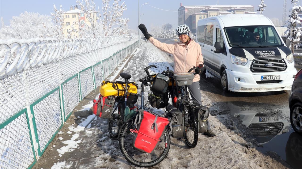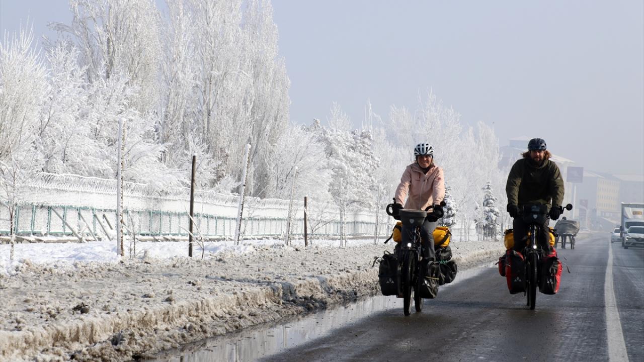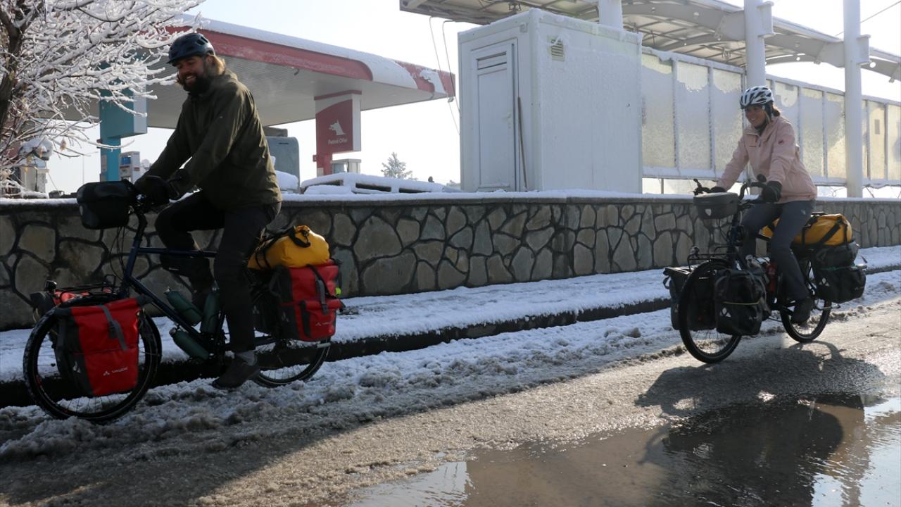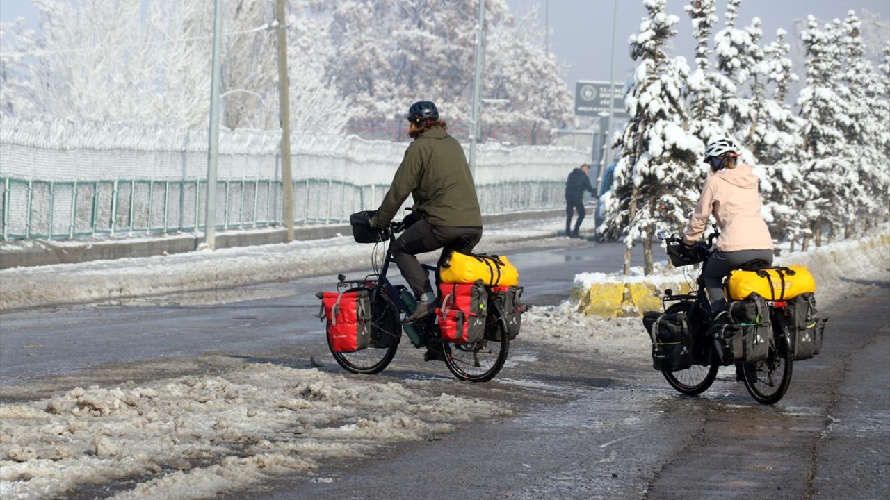 İsviçreli çift, Erzincan ve Erzurum’un zorlu yollarından da bisikletleriyle geçerek Ağrı’ya geldi. Kış mevsiminin çetin geçtiği ve hava sıcaklıklarının bu sıralar sıfırın altında 20 dereceye kadar düştüğü kentte mola veren çift, olumsuz hava koşulları nedeniyle otobüsle Doğubayazıt ilçesini ziyaret etti.