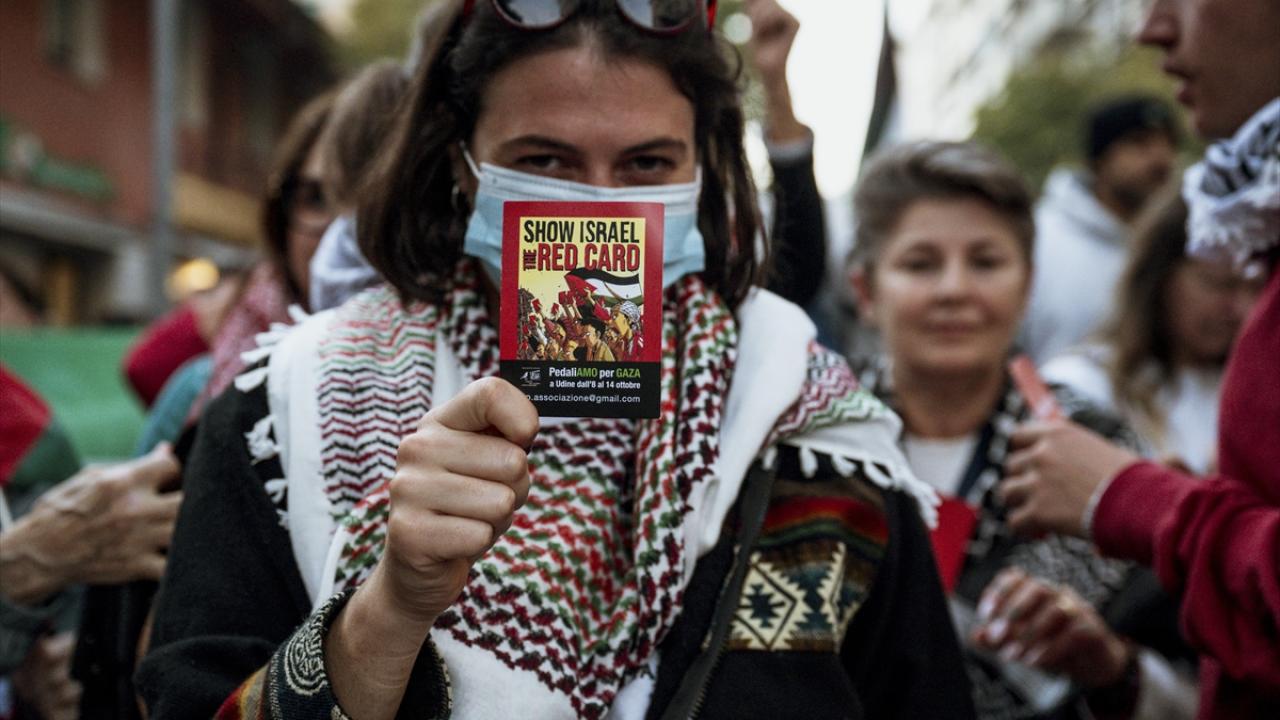 Protestocular, özellikle Gazze`de soykırım yaptığı gerekçesiyle "İsrail`e kırmızı kart göster" dövizi taşırken, İsrail’in uluslararası spor müsabakalarından men edilmesi gerektiğini belirtti.