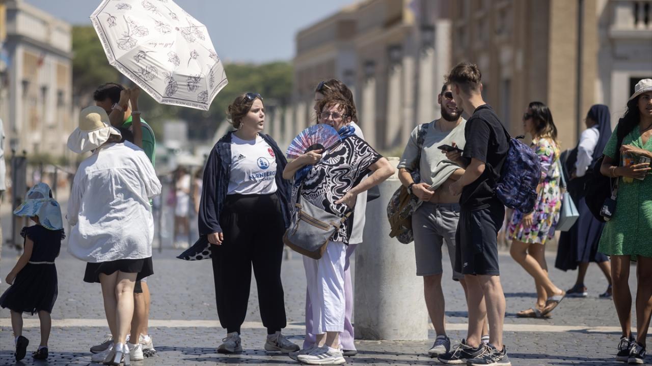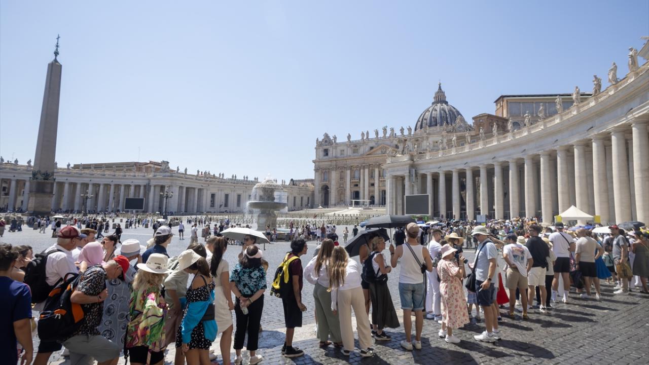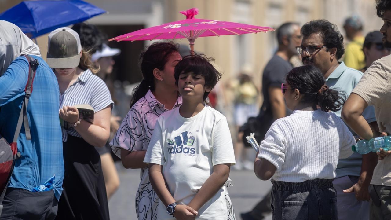 Roma`ya komşu Vatikan Şehir Devleti`ni de ziyaret eden turistler, Aziz Petrus Bazilikasına giriş için aynı isimli meydanda beklerken şemsiyelerle sıcaktan korunmaya çalıştı.