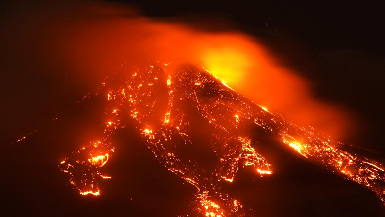 Kızıl lavın kraterden aşağıya doğru inişi ve yoğun bulut tabakası cep telefonuyla kaydedildi.