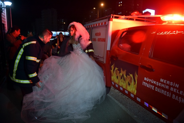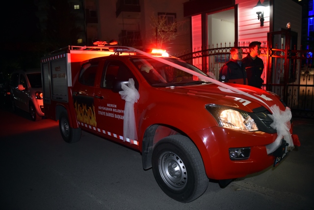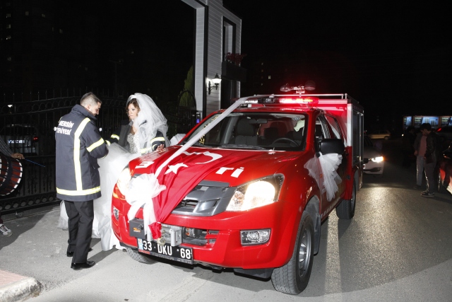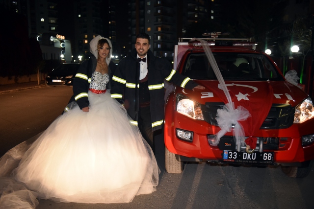 Mersin Büyükşehir Belediyesi İtfaiye Daire Başkanlığında görevli itfaiye eri Yüksel Taşdemir, hayatını birleştireceği eşi 23 yaşındaki Sebiha Karalar'ı düğüne, gelin arabası gibi süslettiği itfaiye aracıyla götürdü.