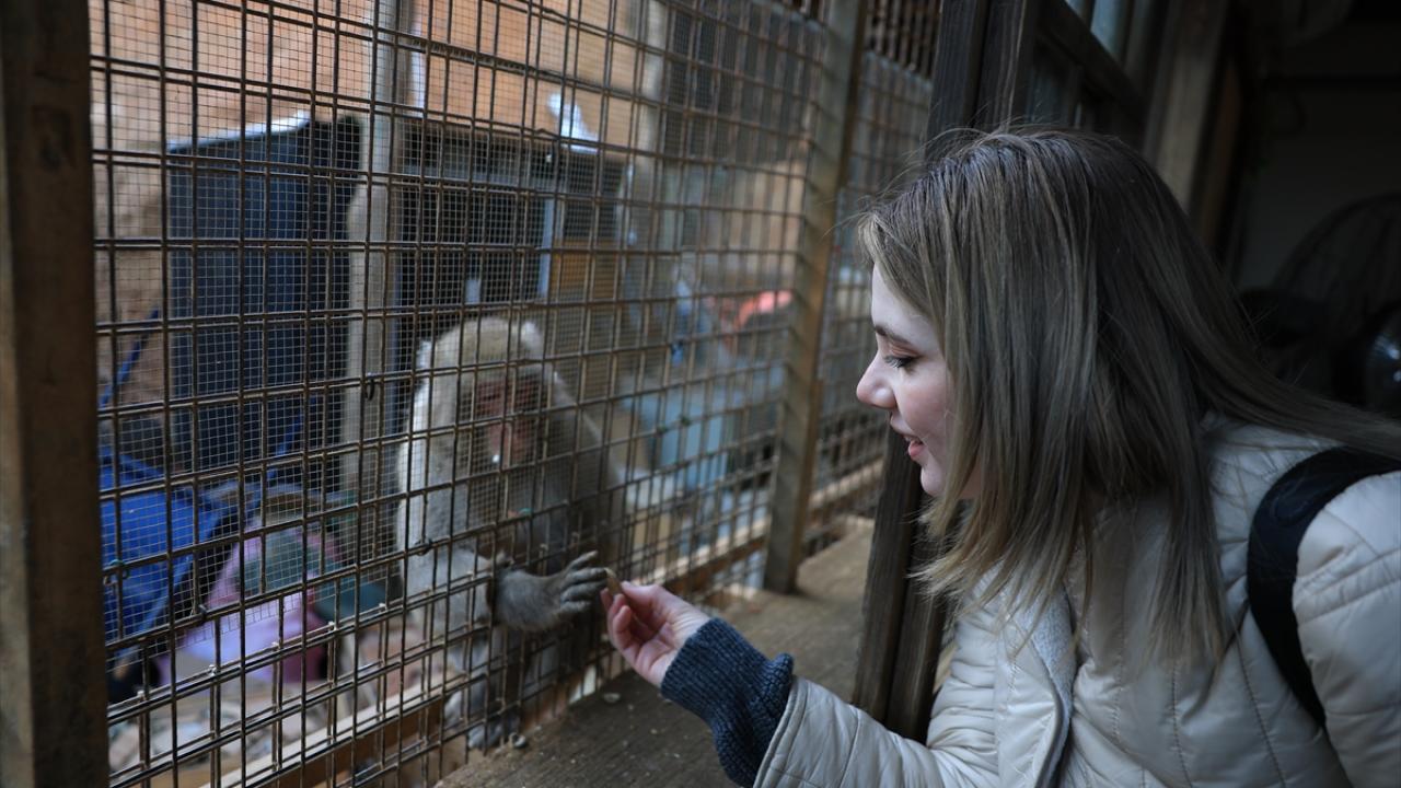 Parkta dolaşan Japon makak maymunları, ziyaretçilerin ilgisini çekiyor.