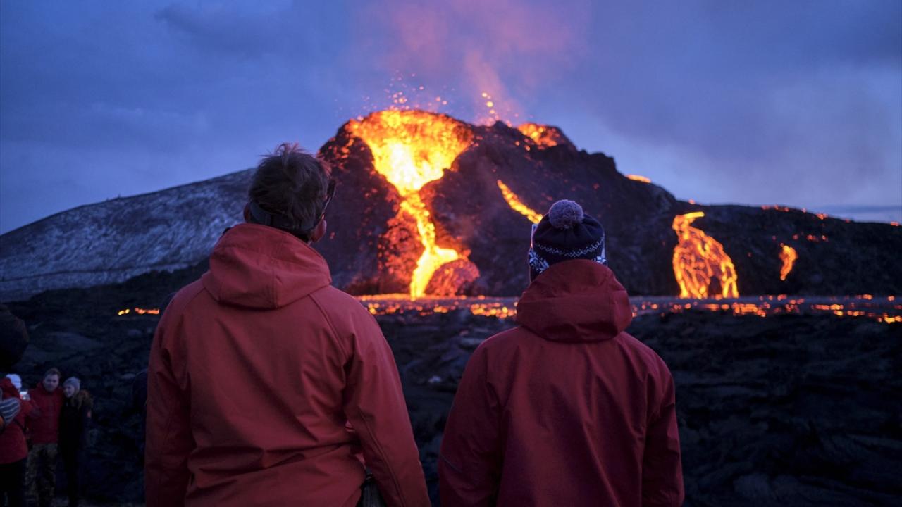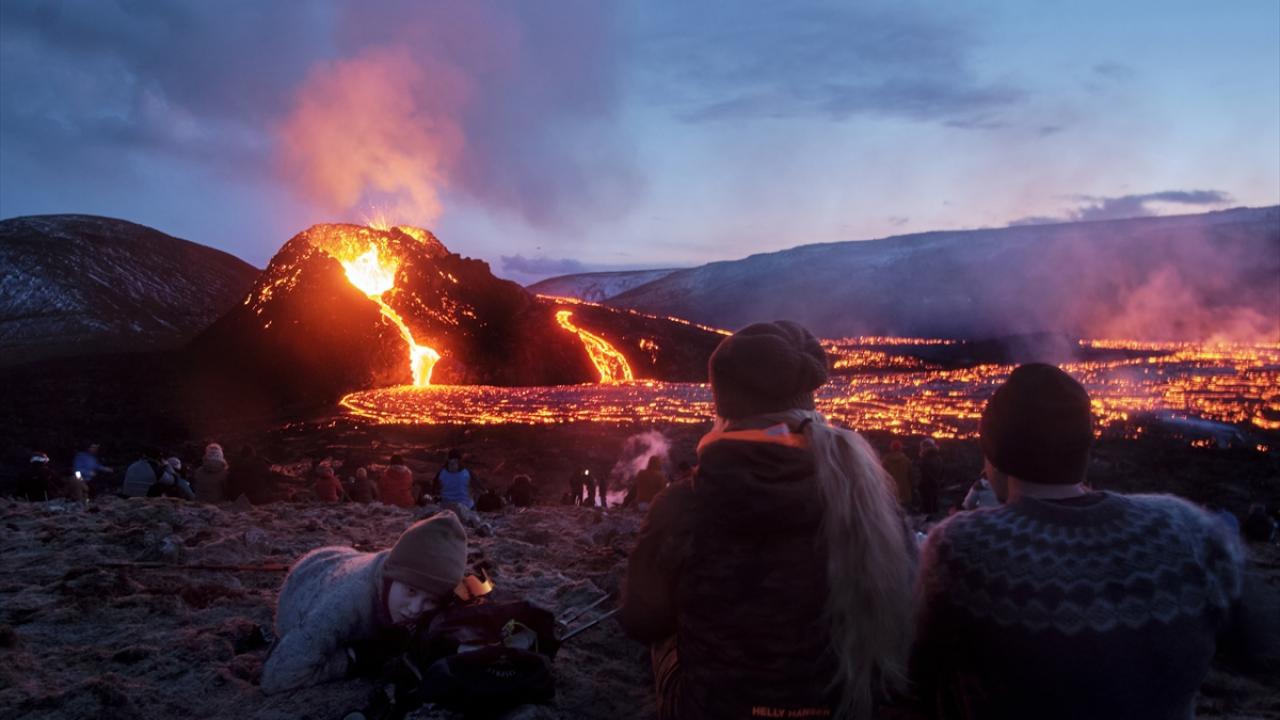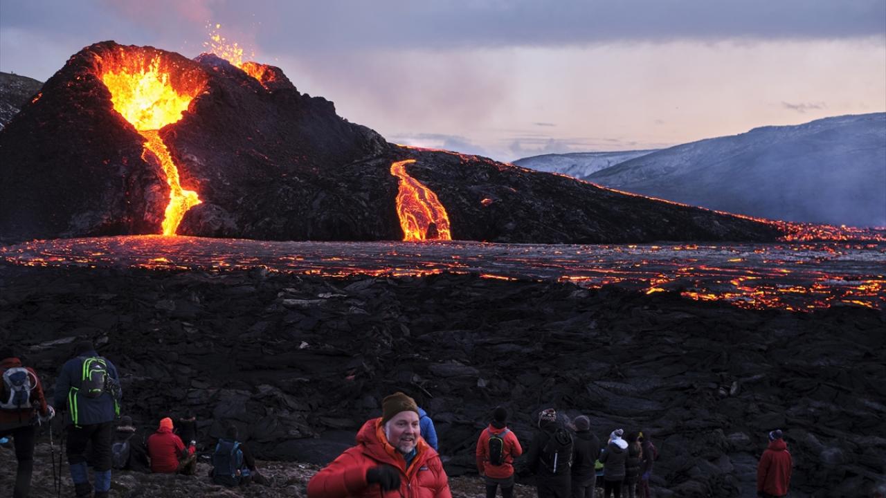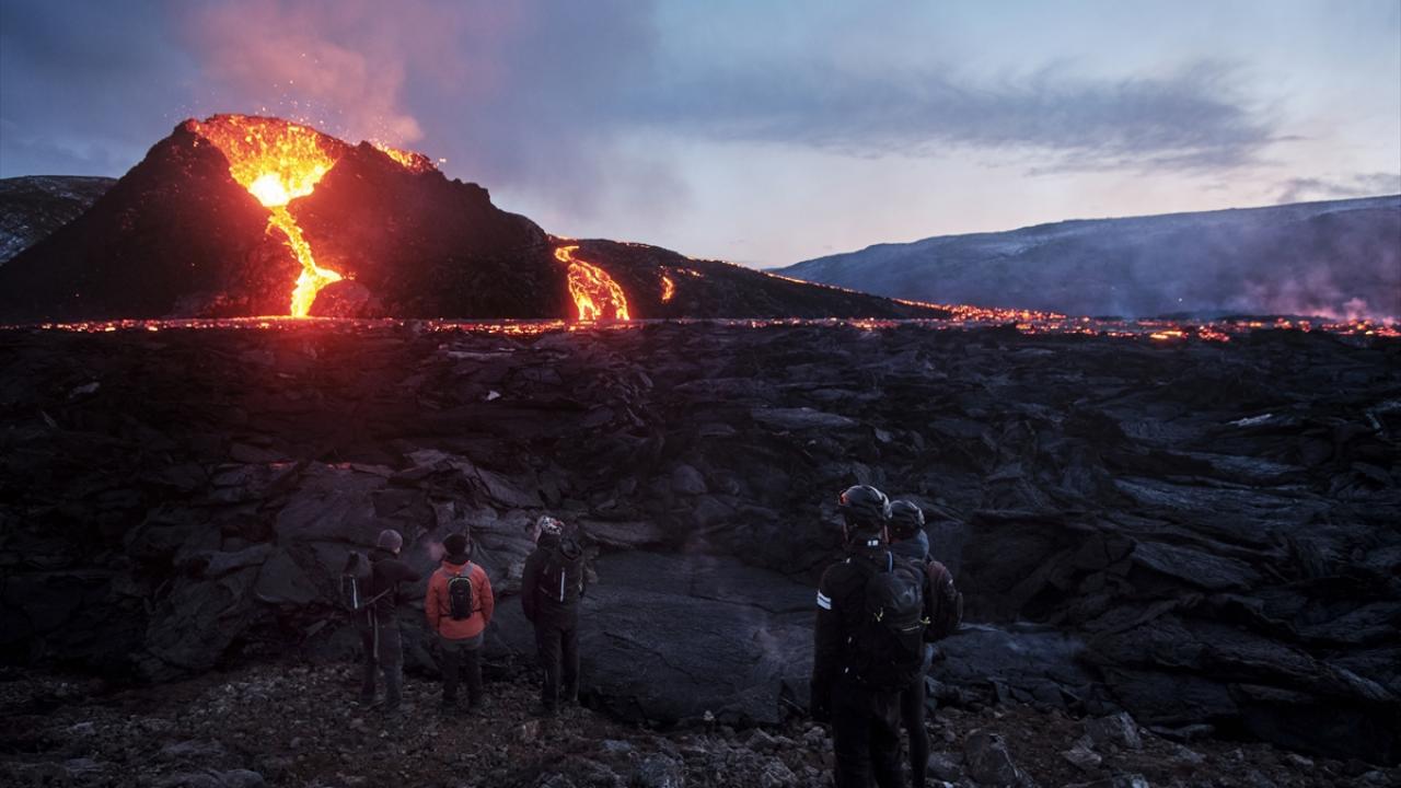 İzlanda'nın güneybatısındaki Reykjanes Yarımadası'nda bulunan Fagradals Yanardağı, 6 bin yıl sonra lav püskürtmeye devam ederken çok sayıda kişi de bölgeye giderek volkanın patlamasını izledi.