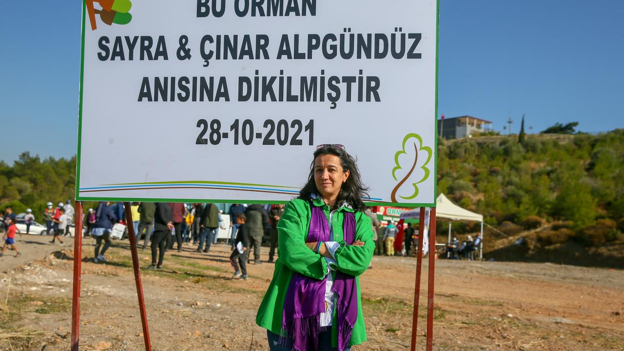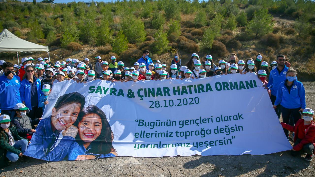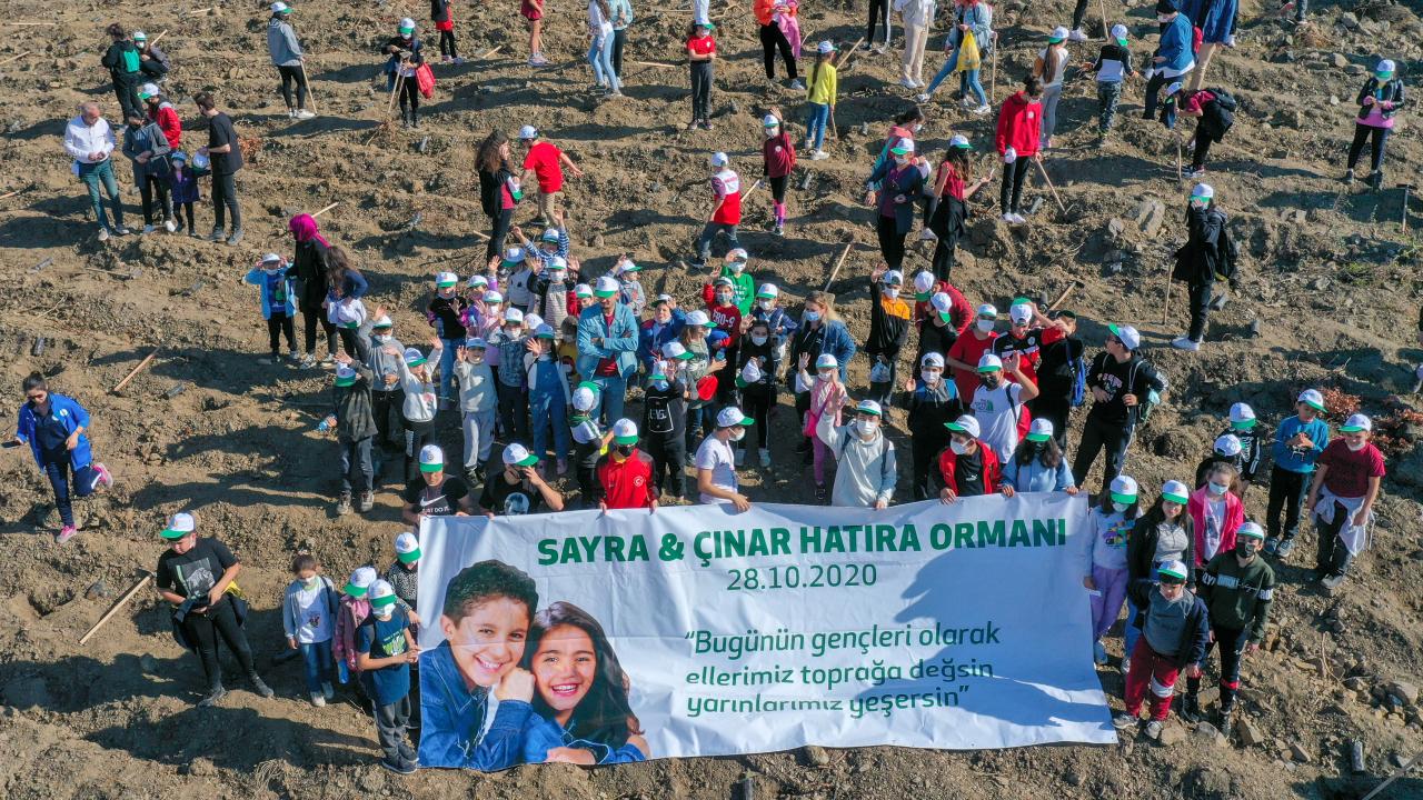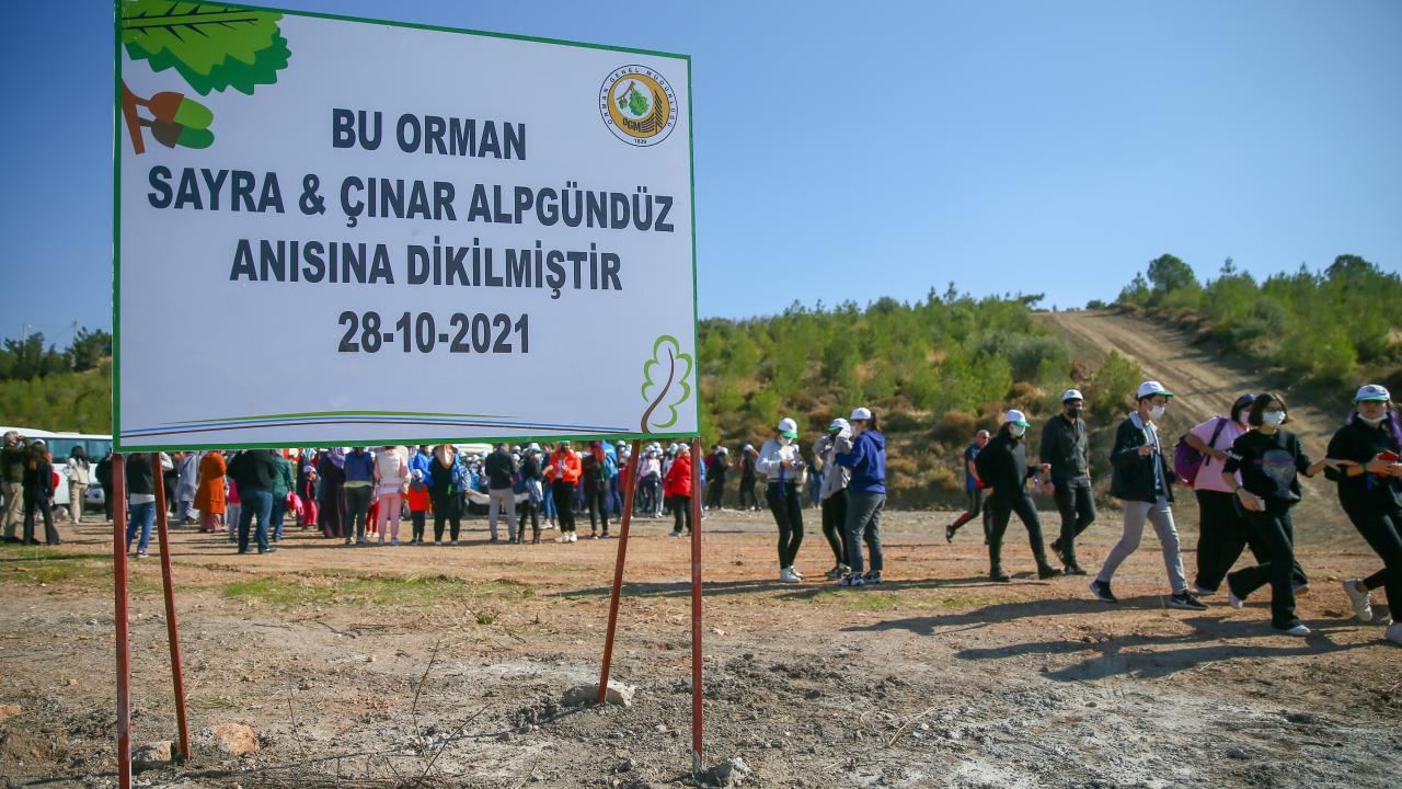 İzmir'de geçen yıl meydana gelen depremde Rıza Bey Apartmanı'nın enkazındaki arama kurtarma çalışmalarında 75 saat sonra cansız bedenlerine ulaşılan 15 yaşındaki ikizler Çınar ve Sayra Alpgündüz adına 1500 fidan dikildi.