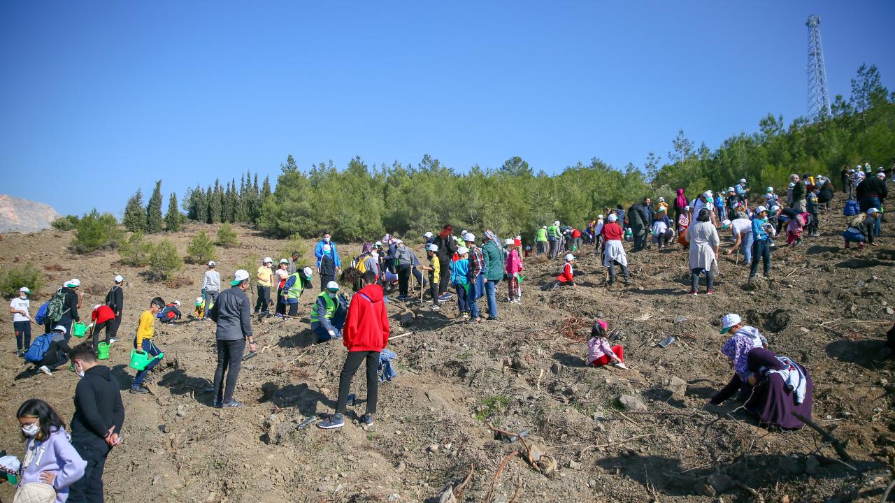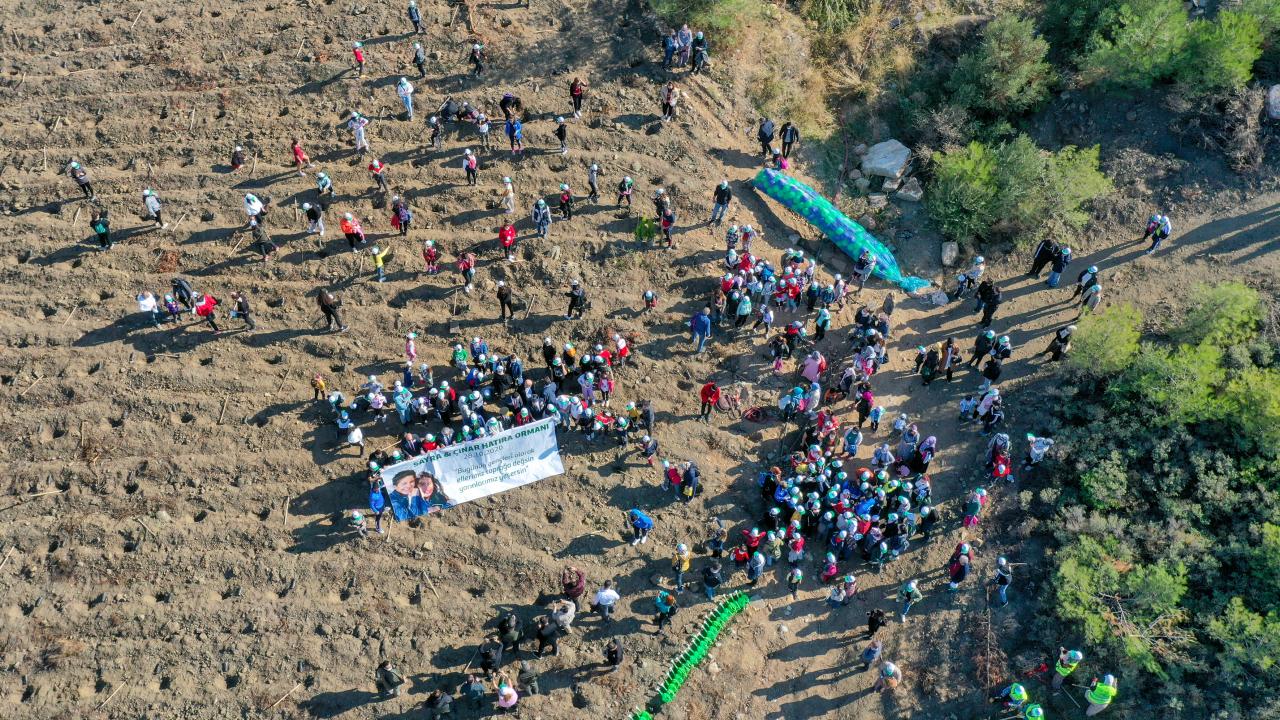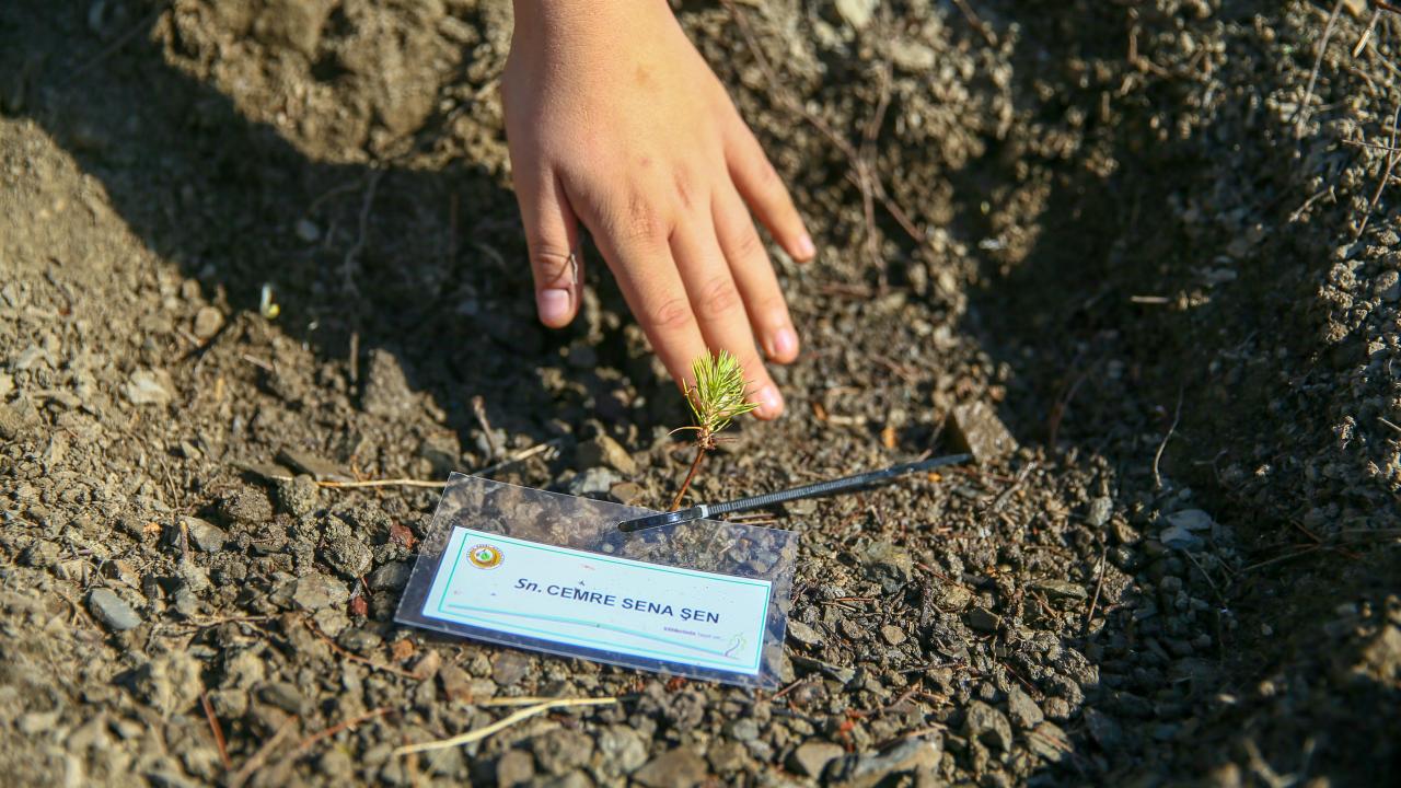 Burada 450 öğrenci, İzmir Orman Bölge Müdürlüğü ekipleriyle 600 selvi ve 900 kızılçam fidanını, ikizlerin anısına toprakla buluşturup can suyunu verdi.