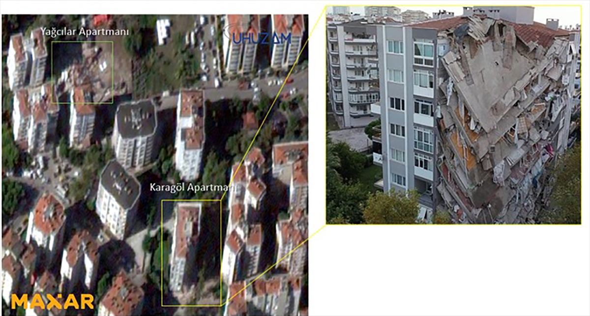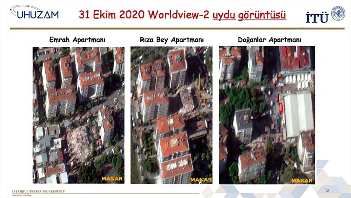 Pleiades ve WorldView-2 uydularıyla 31 Ekim`de alınan kayıtlarda, 112 kişinin yaşamını yitirdiği, 81 kişinin ise kurtulduğu, aralarında Rıza Bey ve Doğanlar apartmanları ile Barış, Emrah ve Cumhuriyet sitelerinin de bulunduğu binaların enkazı görüntülendi.