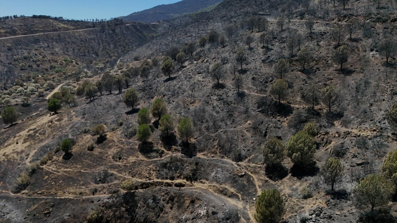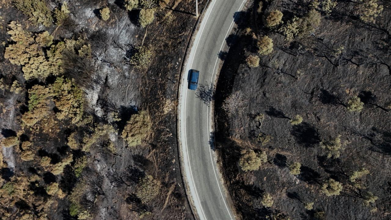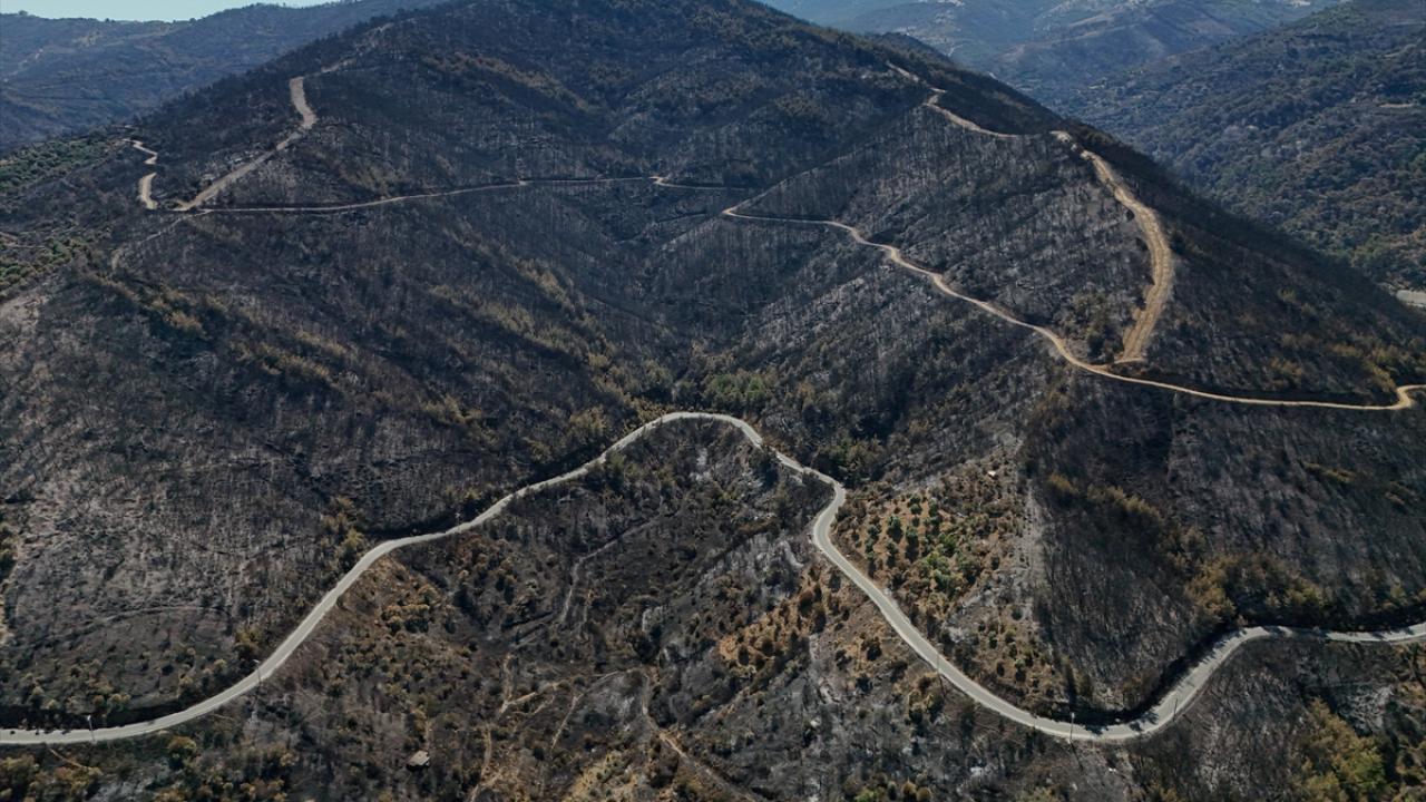 Sarp arazide, yoğun çam ormanlarının yanı sıra zeytin bahçelerinin de bulunduğu bölgede, yangın sonrası yeşil alanların siyaha büründüğü görüldü.