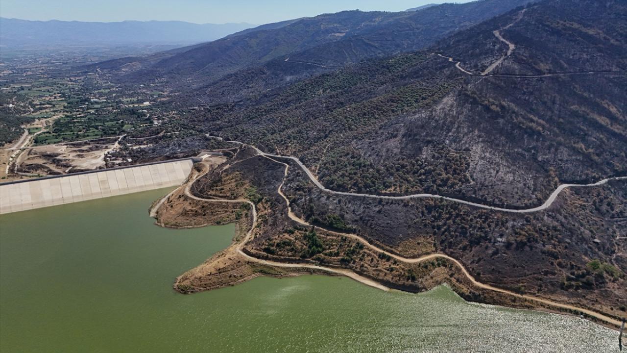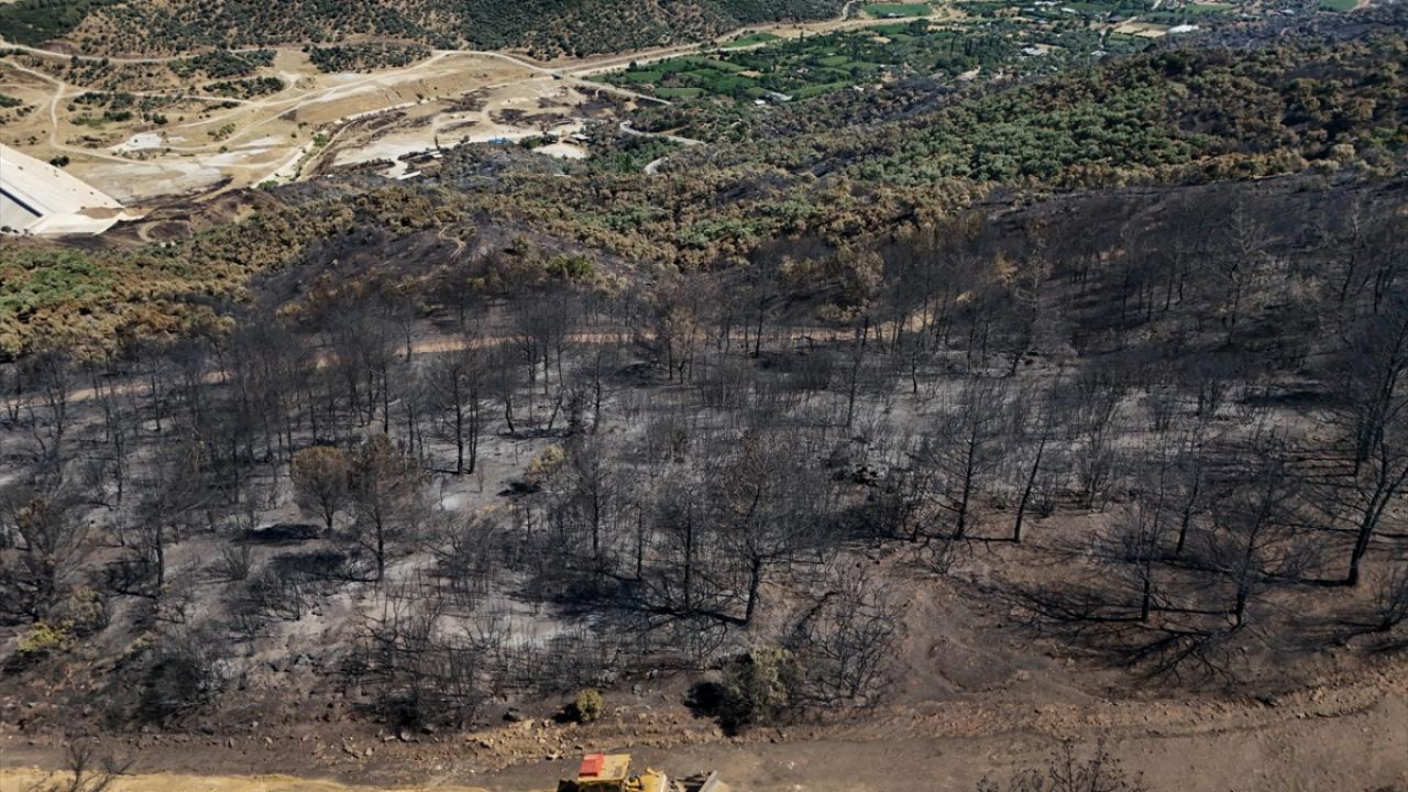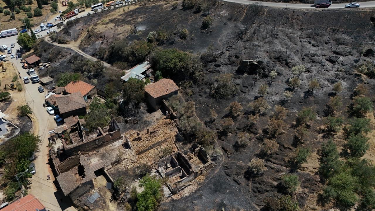 İzmir'in Ödemiş ilçesinde, rüzgarın etkisiyle geniş alana yayılan ancak ekiplerin yoğun müdahalesiyle kontrol altına alınan orman yangınında zarar gören alanlar, evler ve ağıllar havadan görüntülendi.