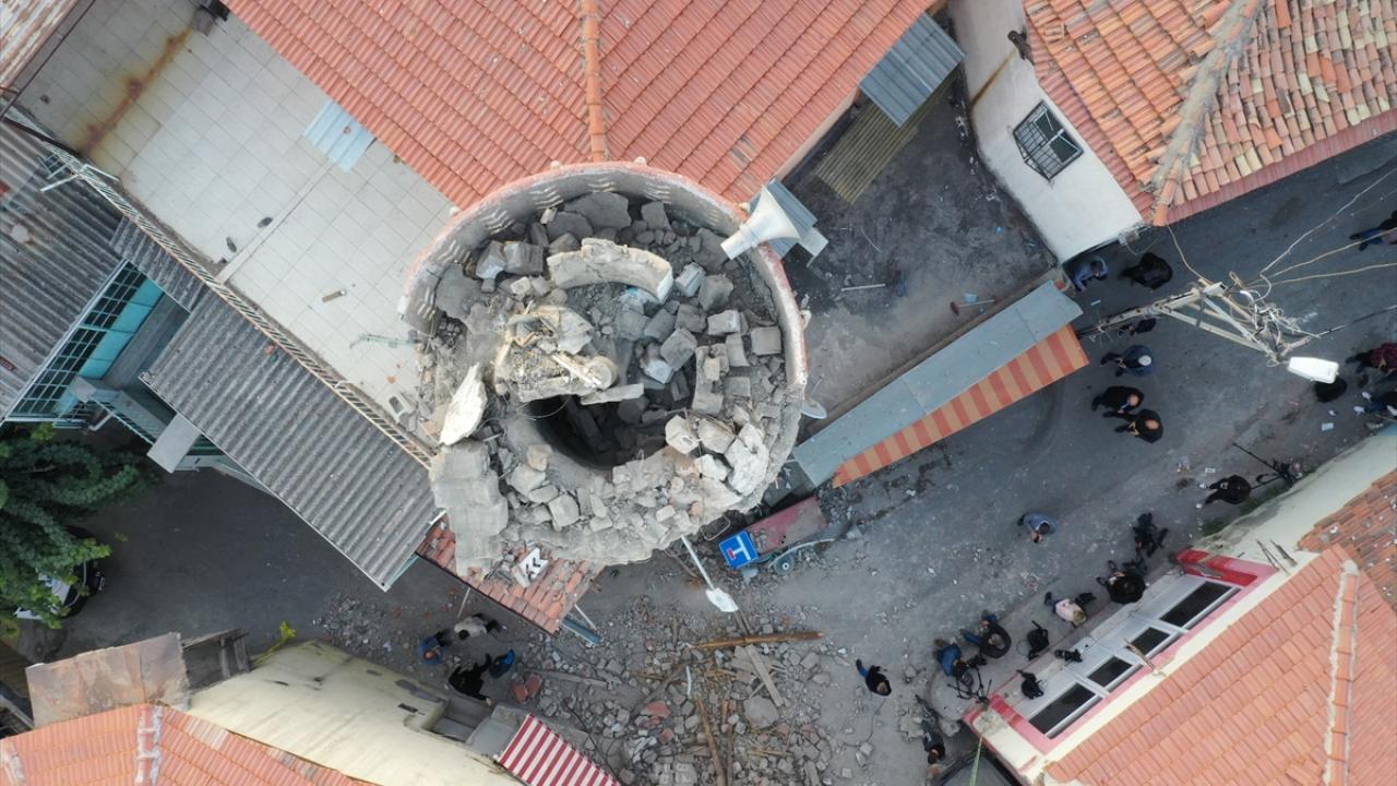 Büyük bir gürültüyle yıkılan minare, depremi yaşayan vatandaşların panik yaşamasına sebep oldu.