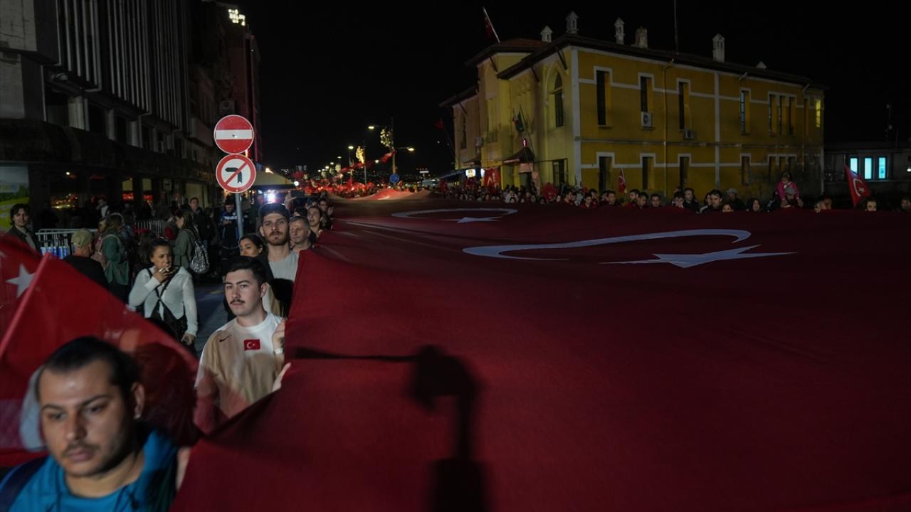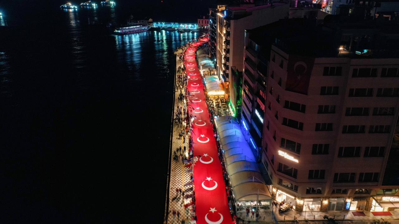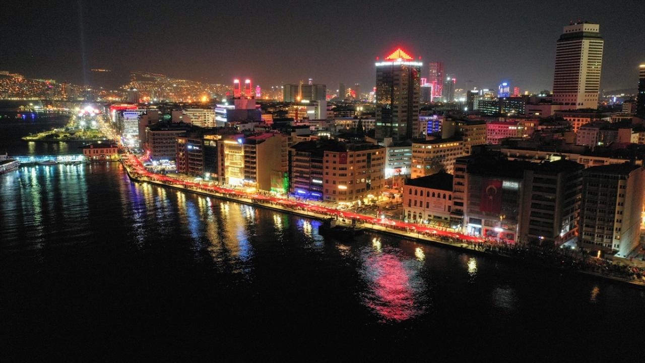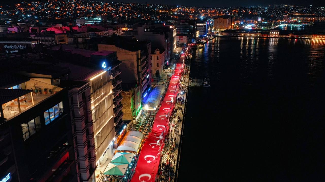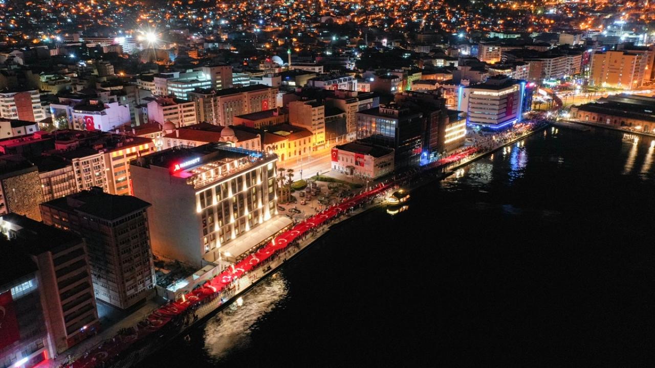 İzmir Valiliği tarafından Cumhuriyet Bayramı kutlamaları kapsamında Konak Meydanı`nda açılan 350 metrelik Türk bayrağı ile Cumhuriyet Meydanı`na yürüyüş ve fener alayı düzenlendi.