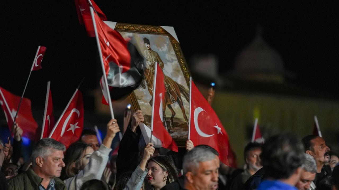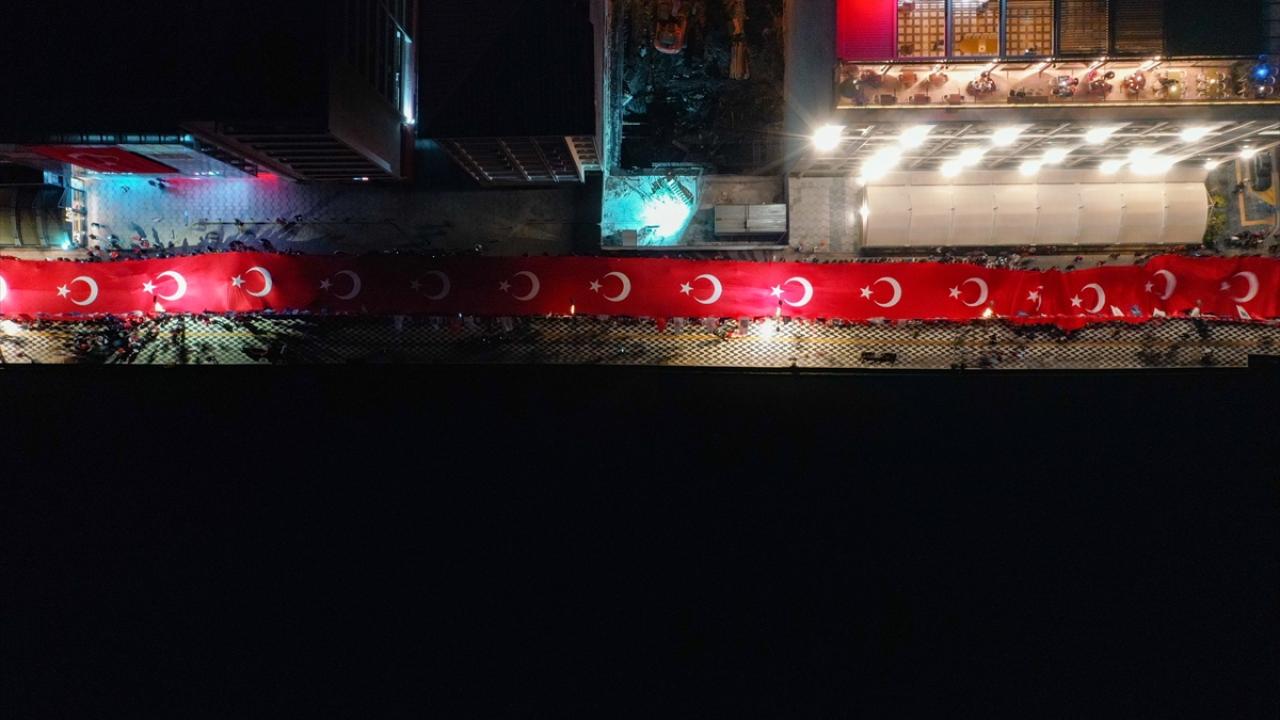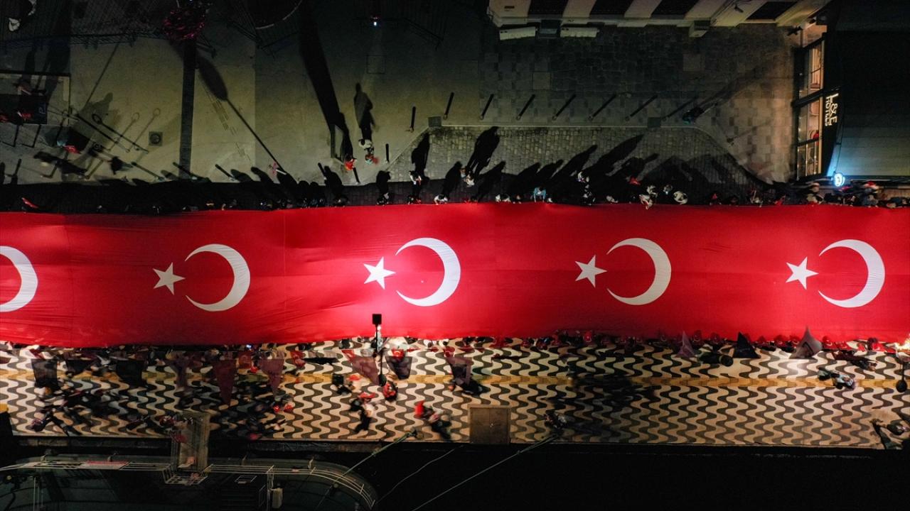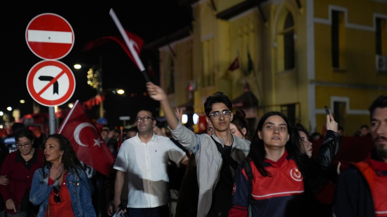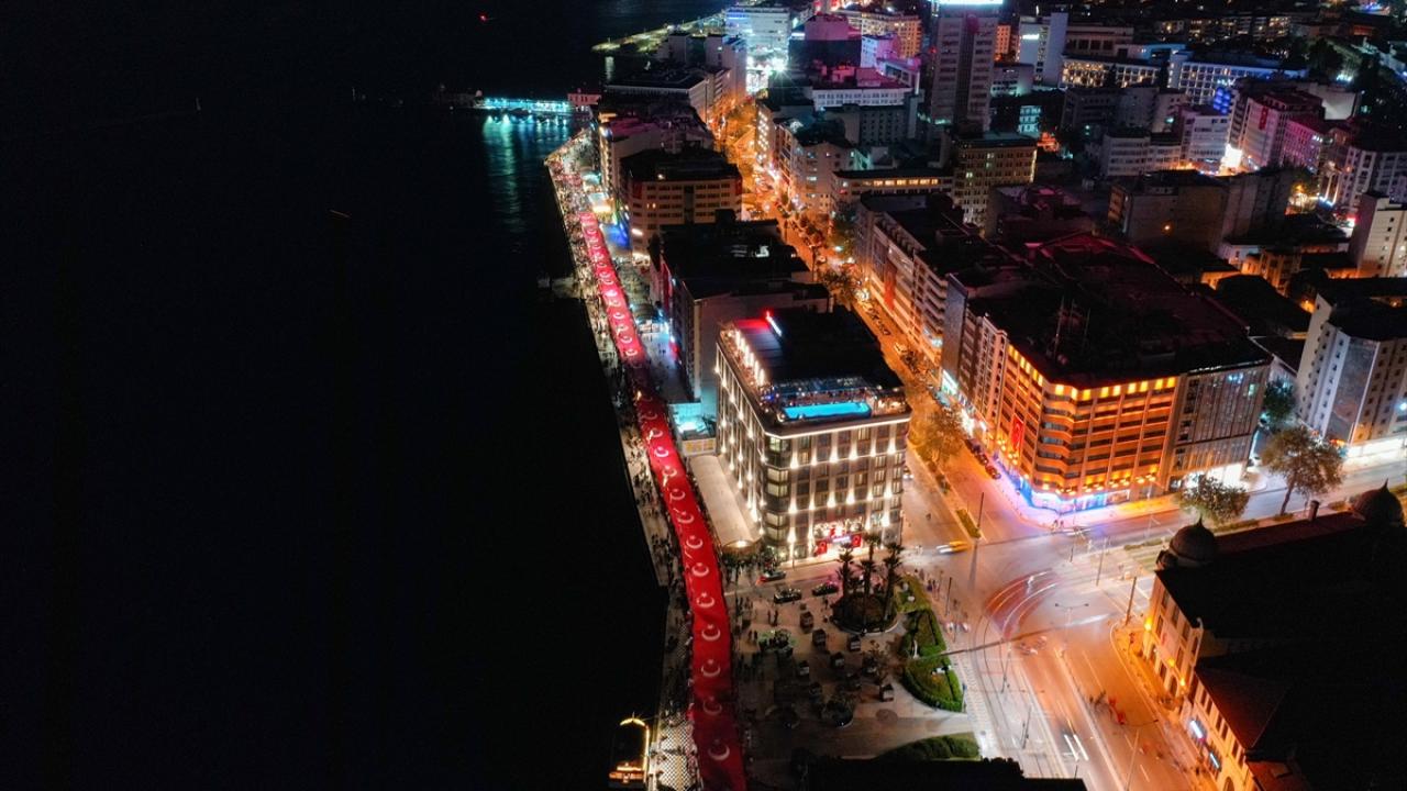 İzmir Valiliği tarafından Cumhuriyet Bayramı kutlamaları kapsamında Konak Meydanı`nda açılan 350 metrelik Türk bayrağı ile Cumhuriyet Meydanı`na yürüyüş ve fener alayı düzenlendi.