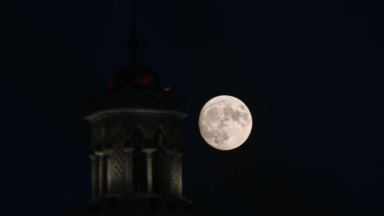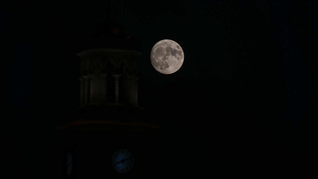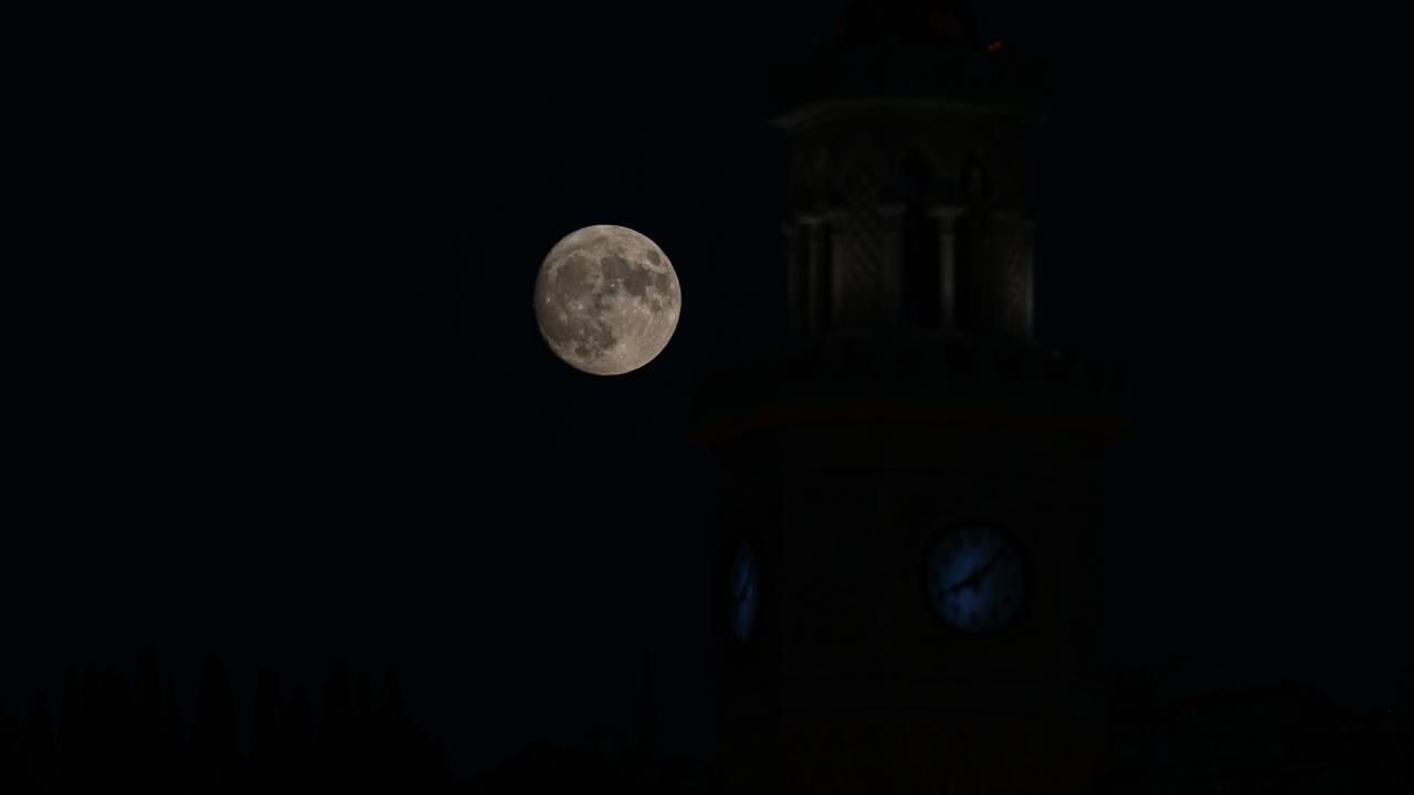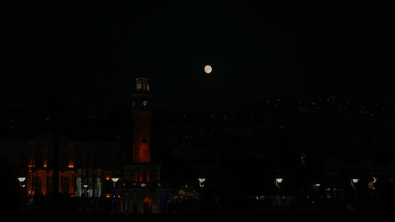 İzmir'de akşam saatlerinde beliren dolunay, Konek Meydanı'ndaki Saat Kulesi ile kentin tepe noktalarındaki Kadifekale Hava Şehitliği ve Kadifekale Mahallesi ile güzel görüntüler oluşturdu.