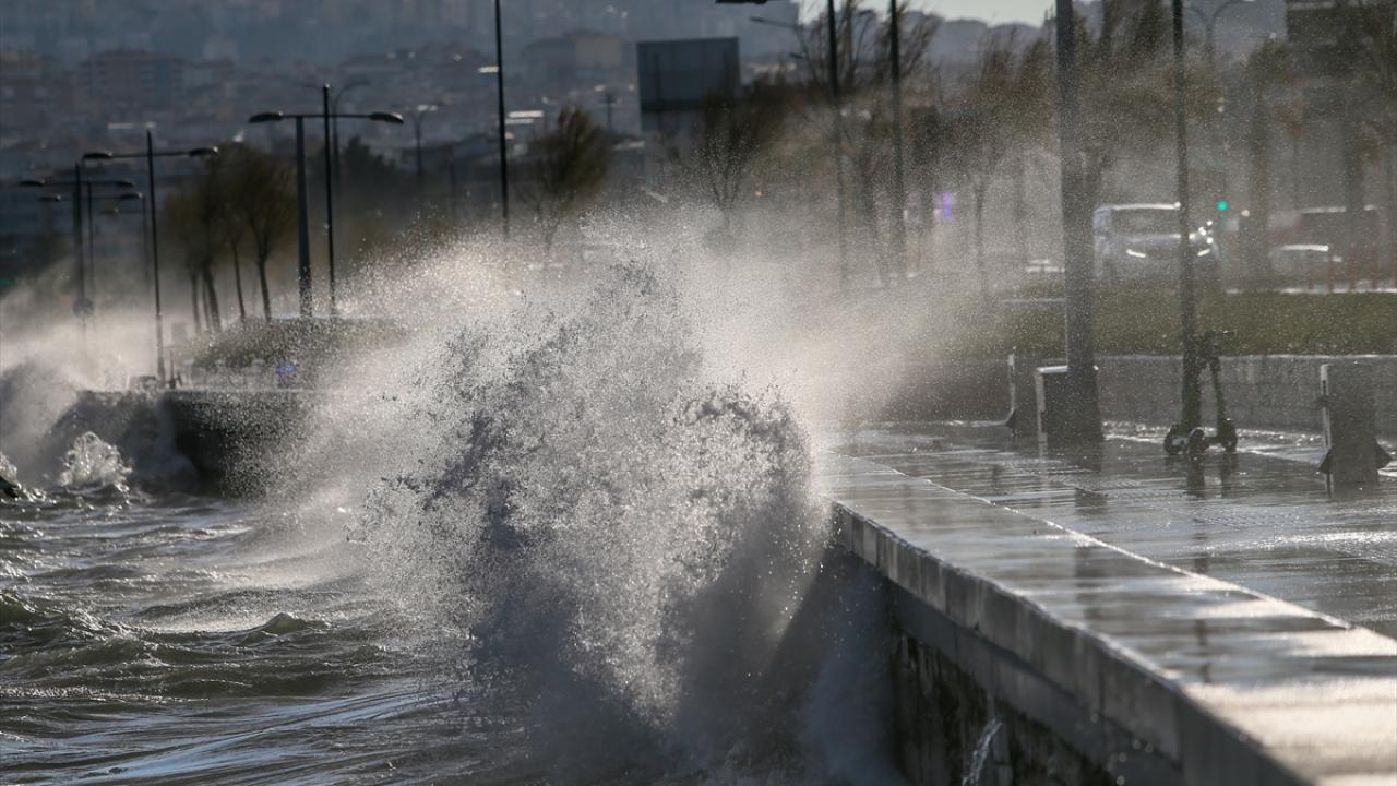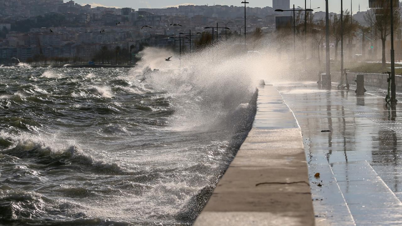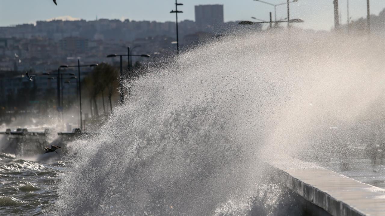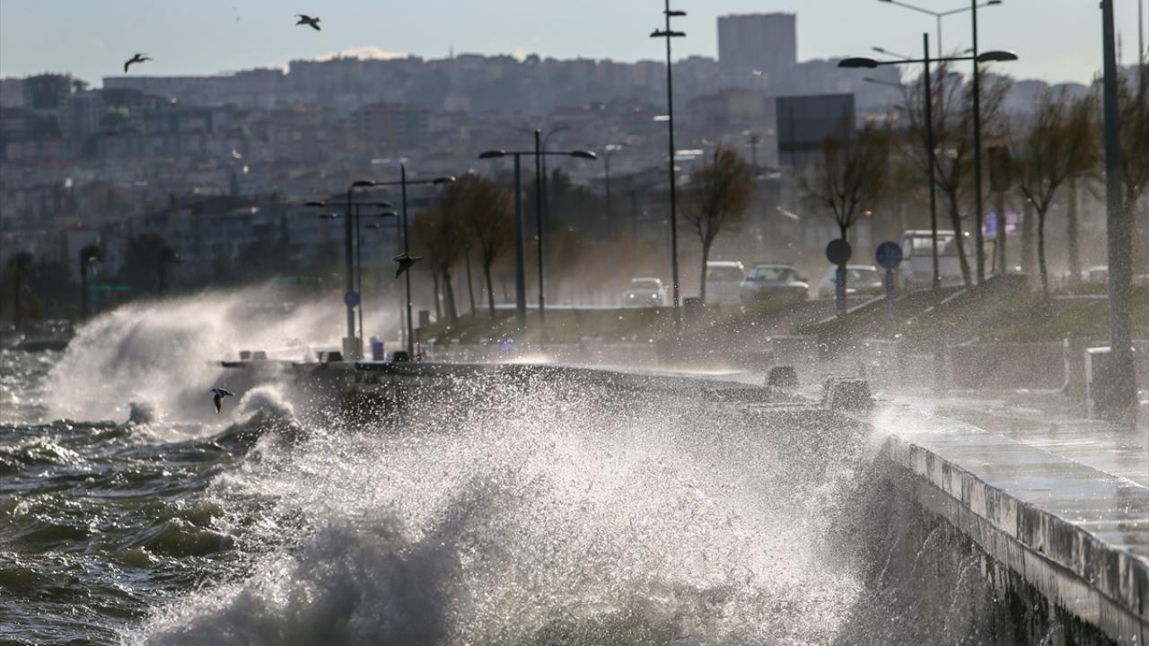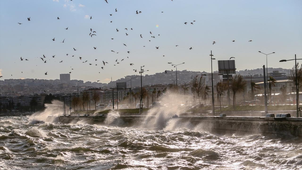 İzmir Körfezi`nde de kıyıya vuran dalgalar, Göztepe sahilindeki yürüyüş yolunda taşkınlara neden oldu.