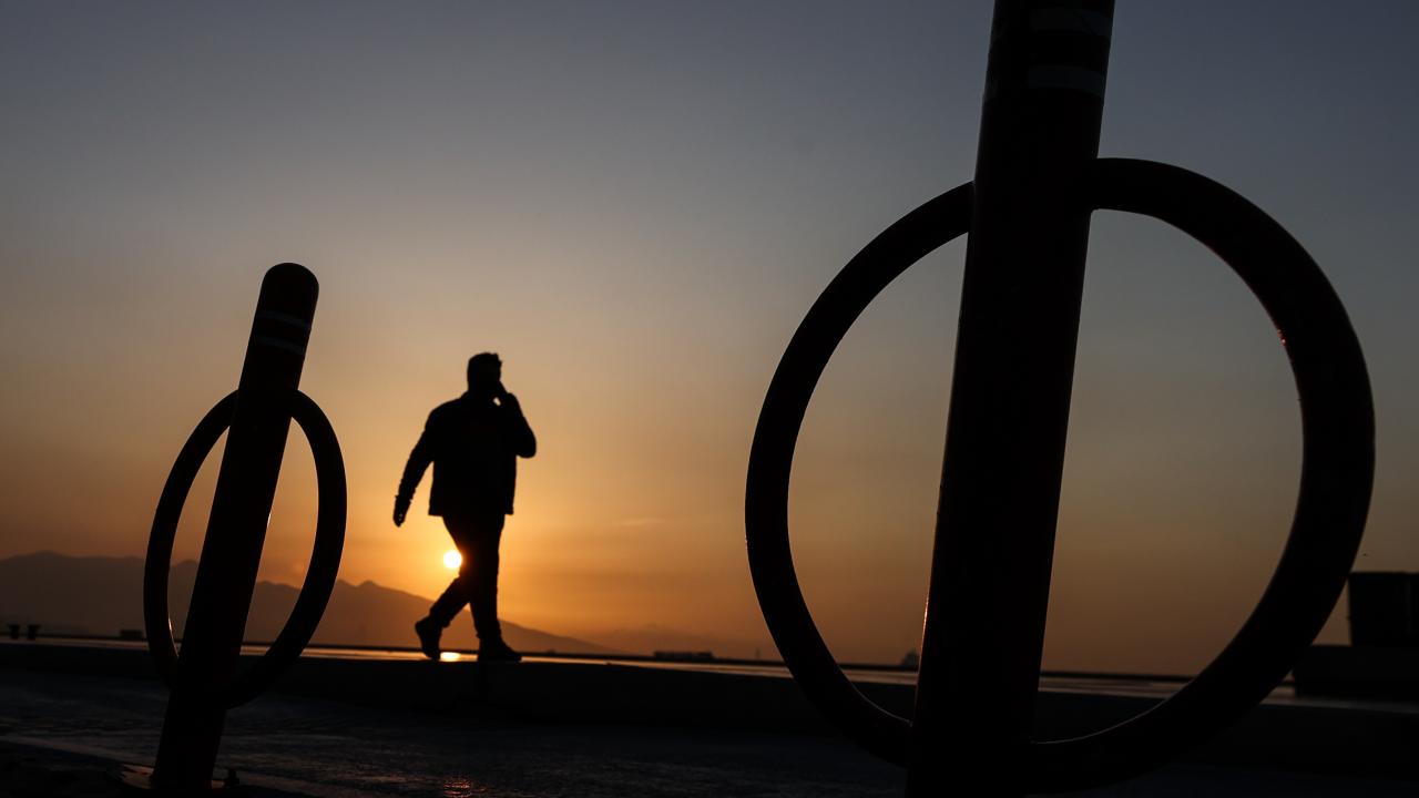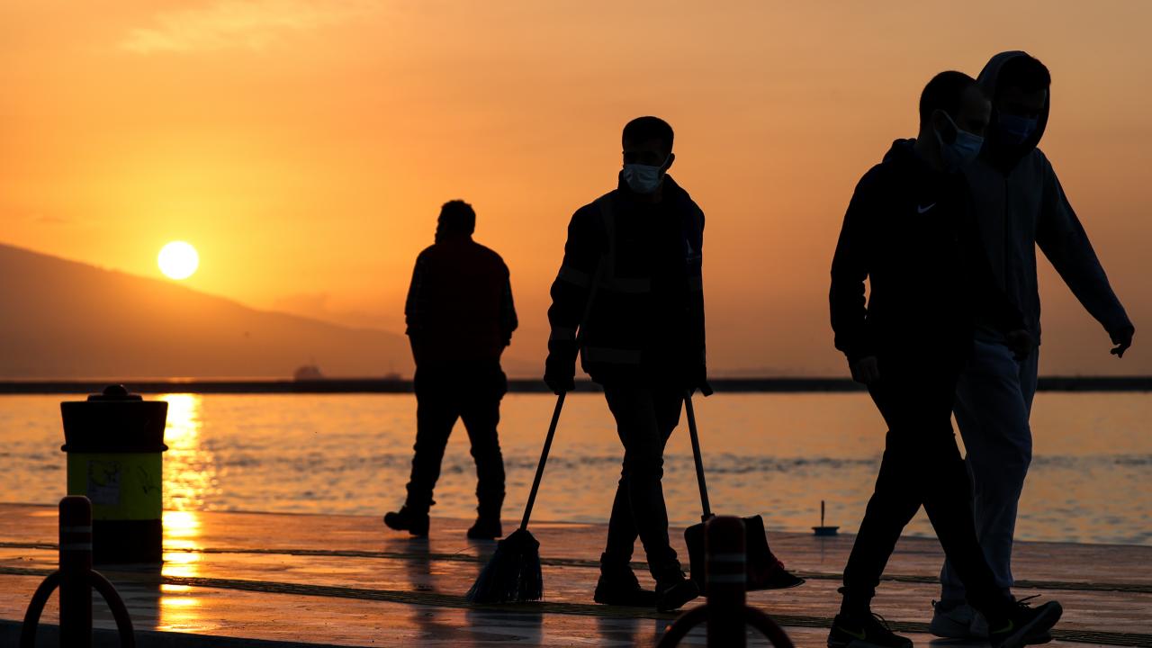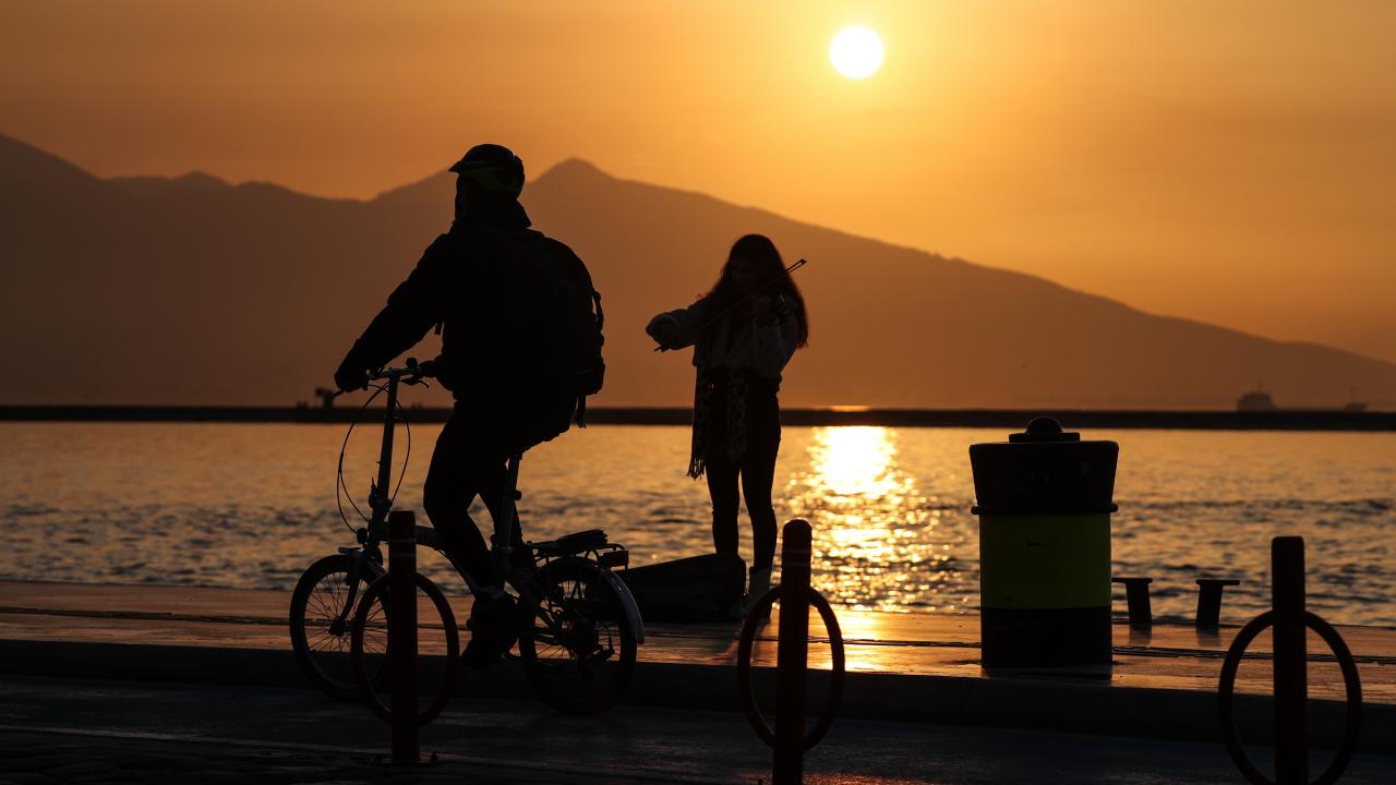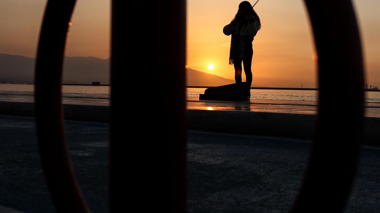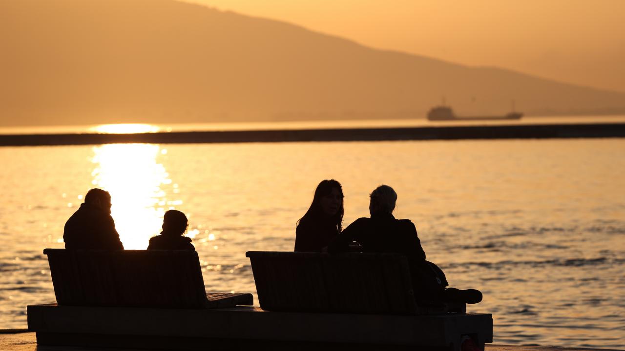 İzmir'de gün batımında güzel görüntüler oluştu. Bazı vatandaşlar kordon boyunda yürüyüş yaptı.