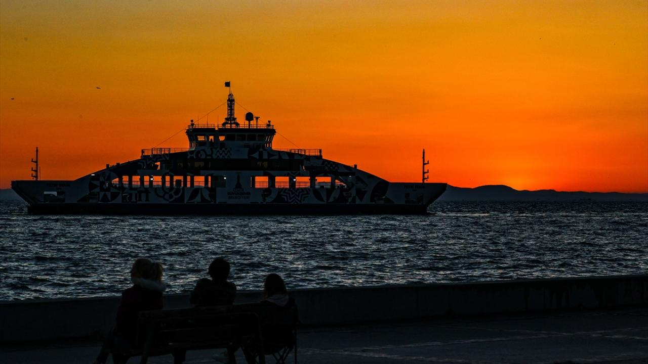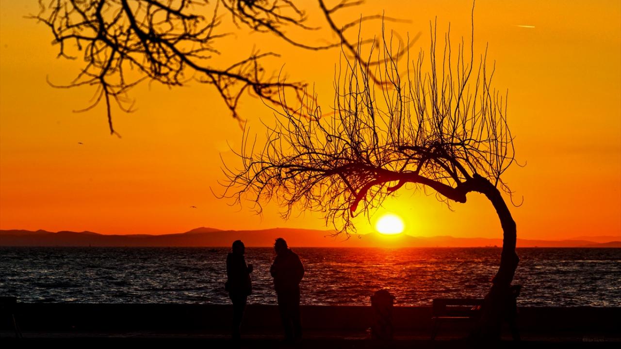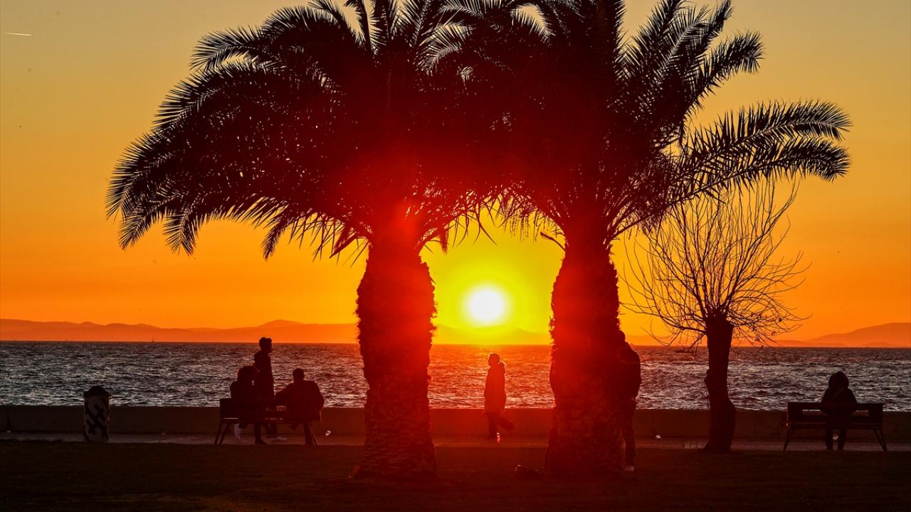 İzmir Körfezi üzerinden batan güneş, Karşıyaka ilçesindeki sahil yolunda renkli görüntüler oluşturdu.
