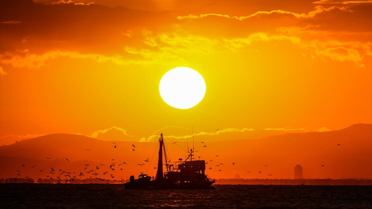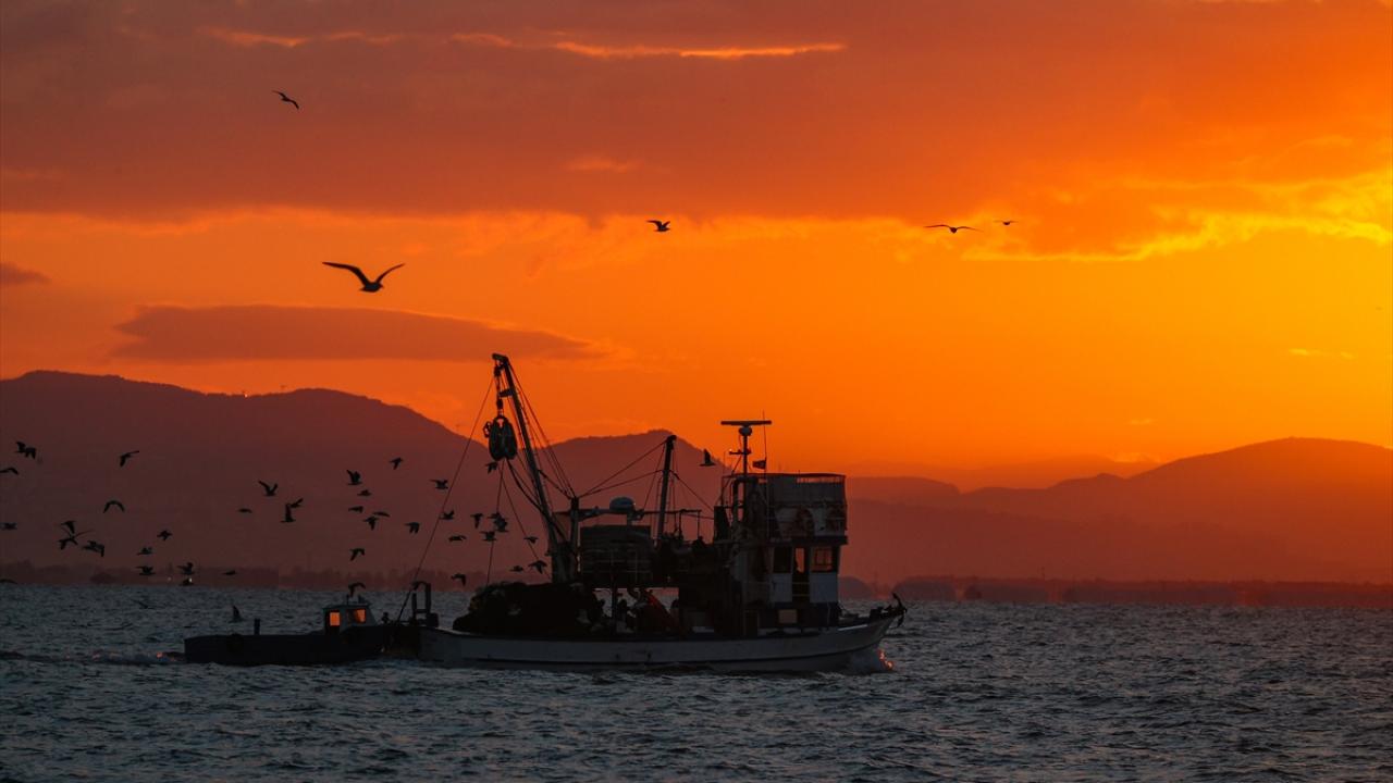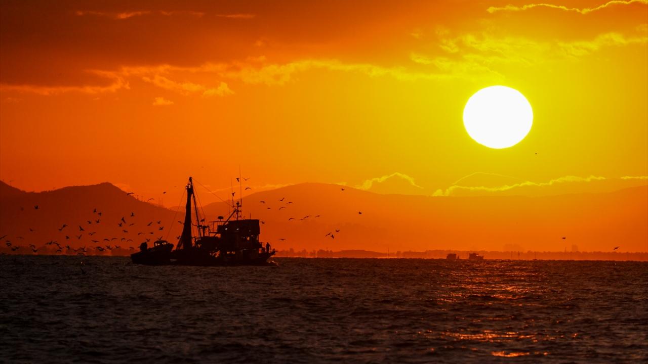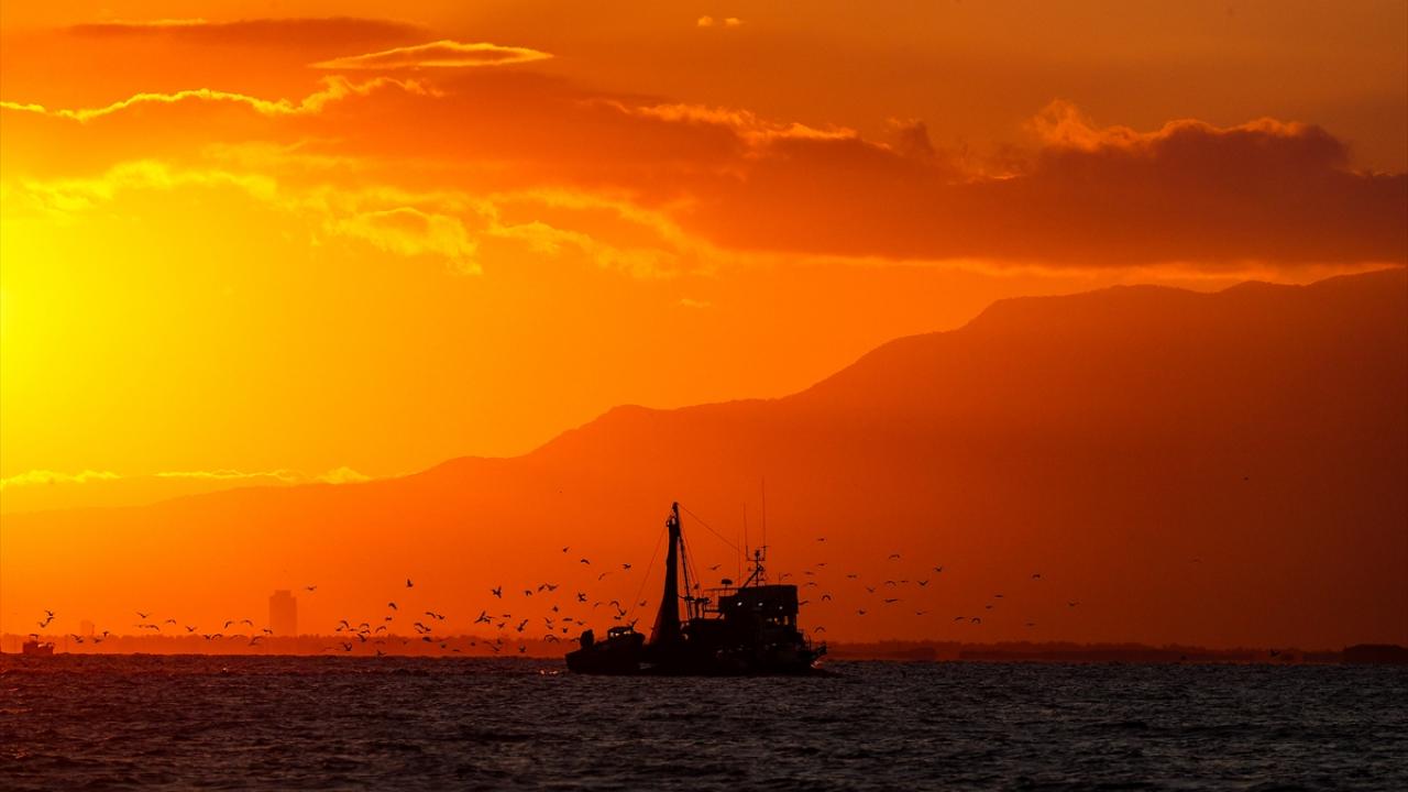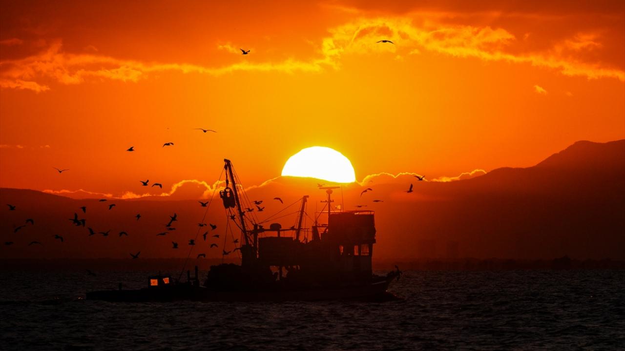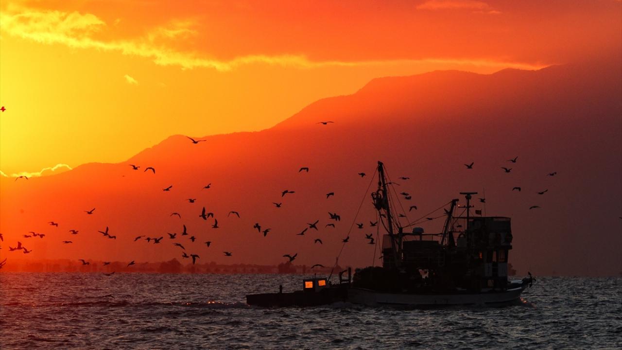 İzmir Körfezi'nde martılar eşliğinde limana yanaşan balıkçı teknesi gün doğumunda güzel görüntü oluşturdu.