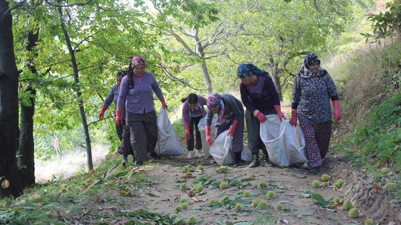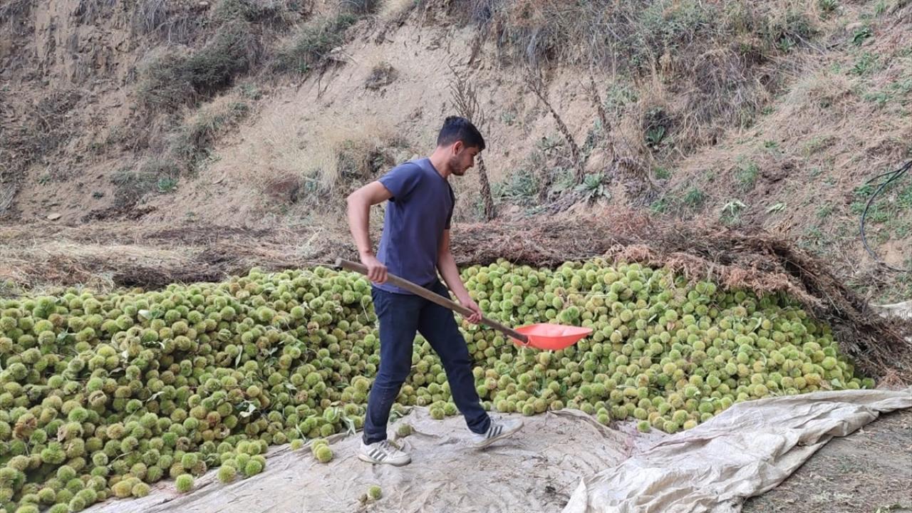 Yüksek ağaçlara tırmanan işçilerin sırıklarla düşürdüğü kestane kozalakları, çuvallanarak meyvelerinin ayrılması için kuyulara gömülüyor.