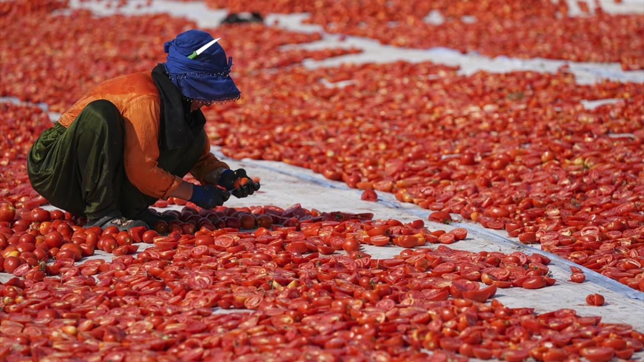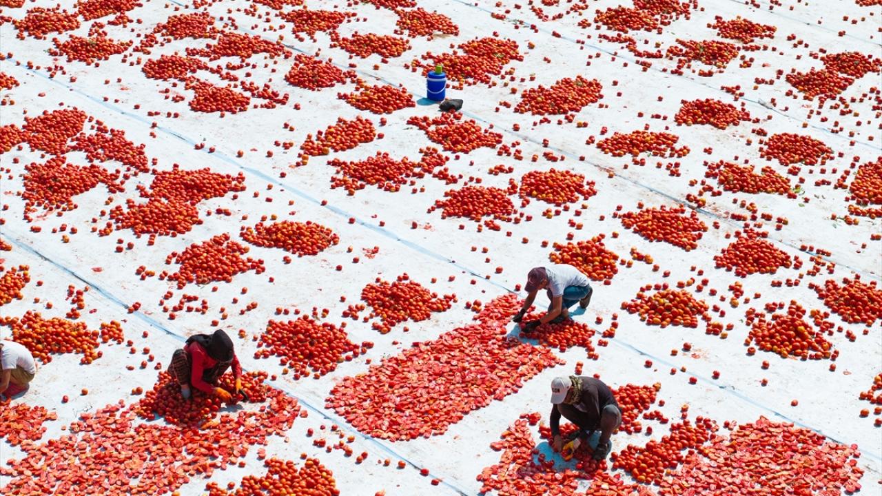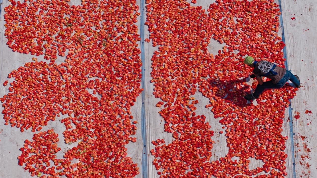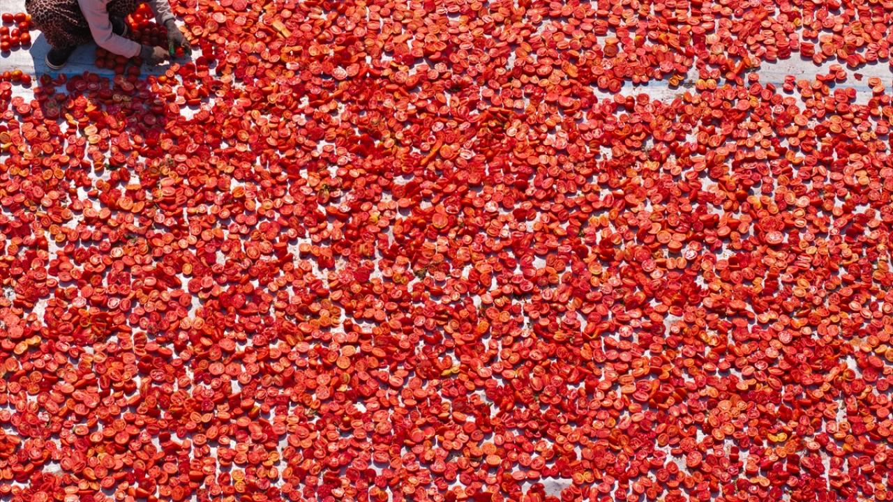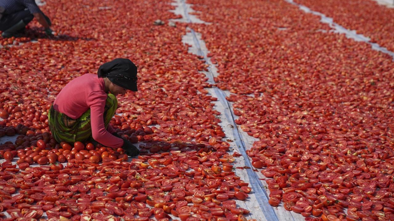 Tarım işçileri tarafından ikiye bölünerek örtülerin üzerine sıralanan domatesler, müşteri talebine göre kükürtlü veya tuzlu olarak 1 hafta güneş altında bekletilerek kurutuluyor.