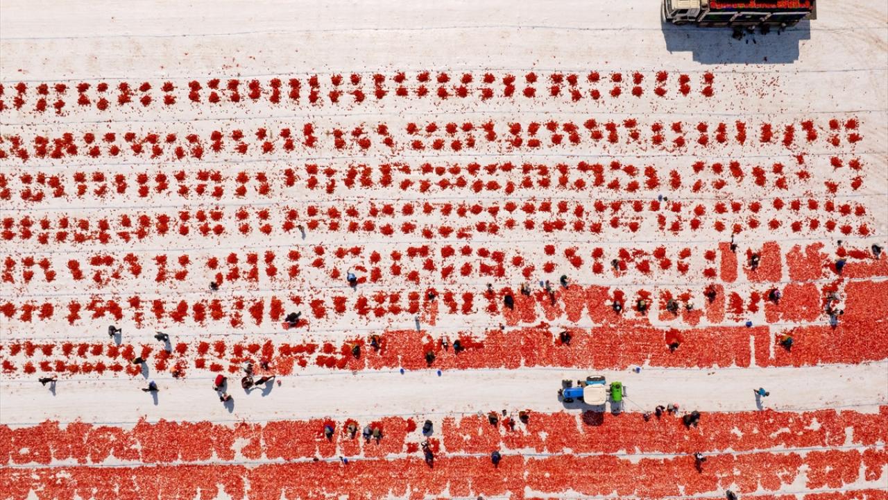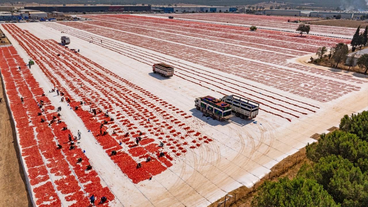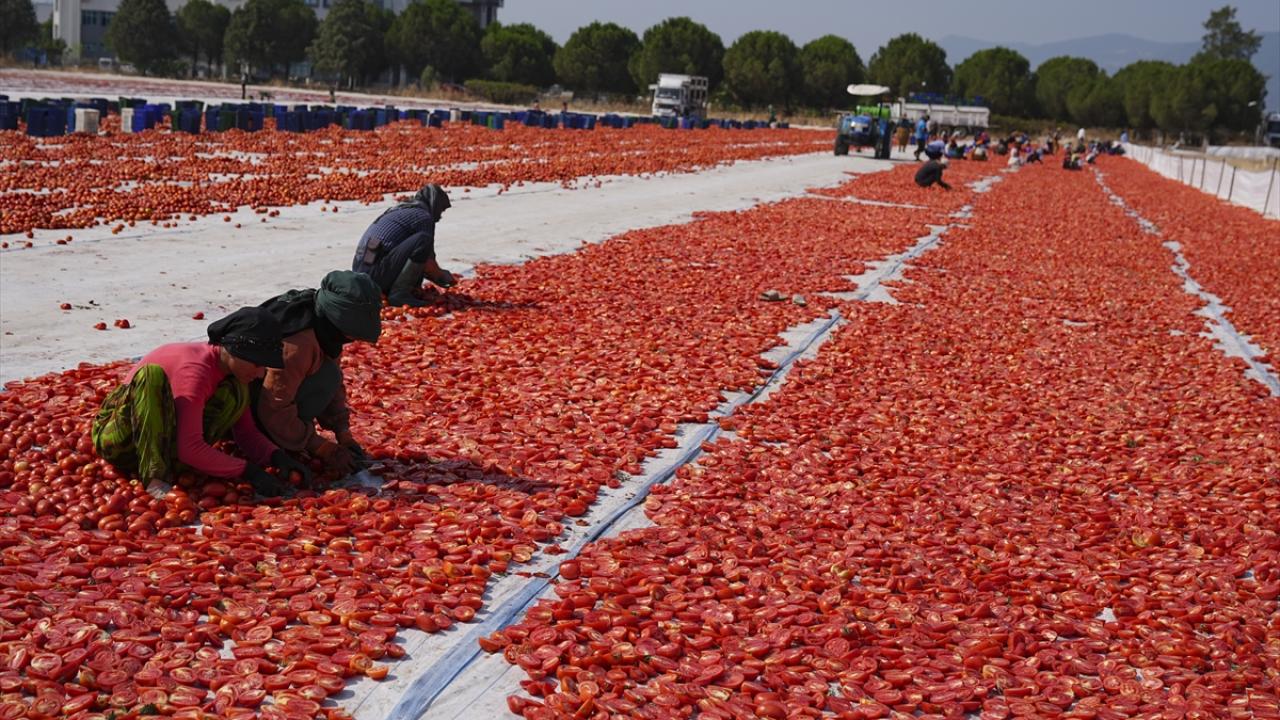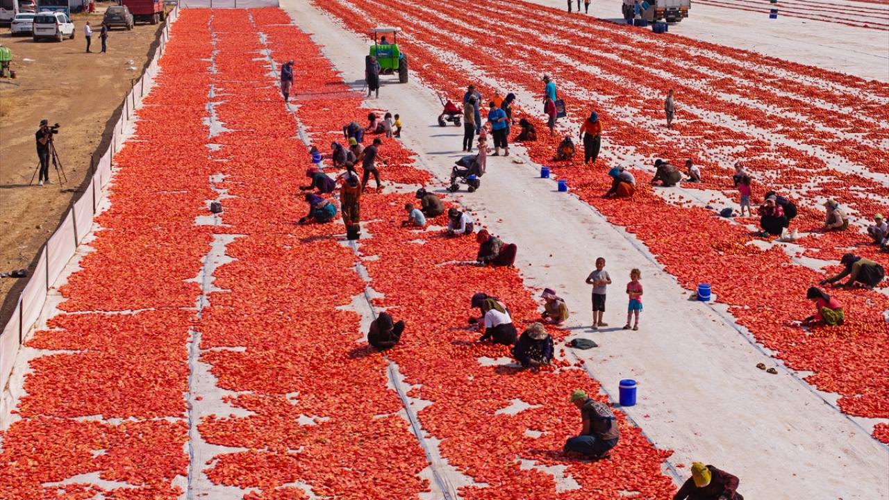 Tarım işçileri tarafından ikiye bölünerek örtülerin üzerine sıralanan domatesler, müşteri talebine göre kükürtlü veya tuzlu olarak 1 hafta güneş altında bekletilerek kurutuluyor.