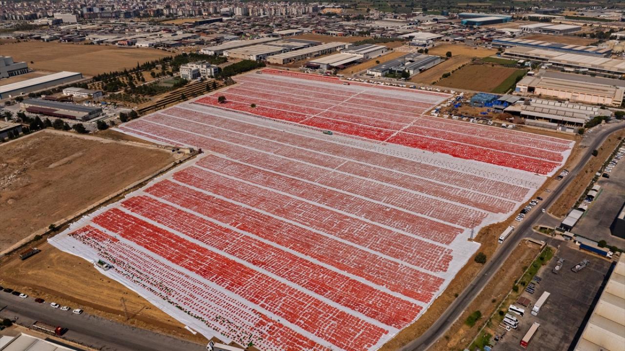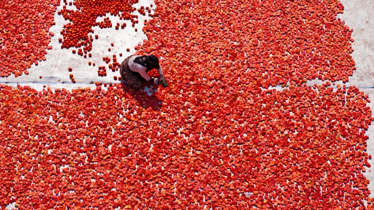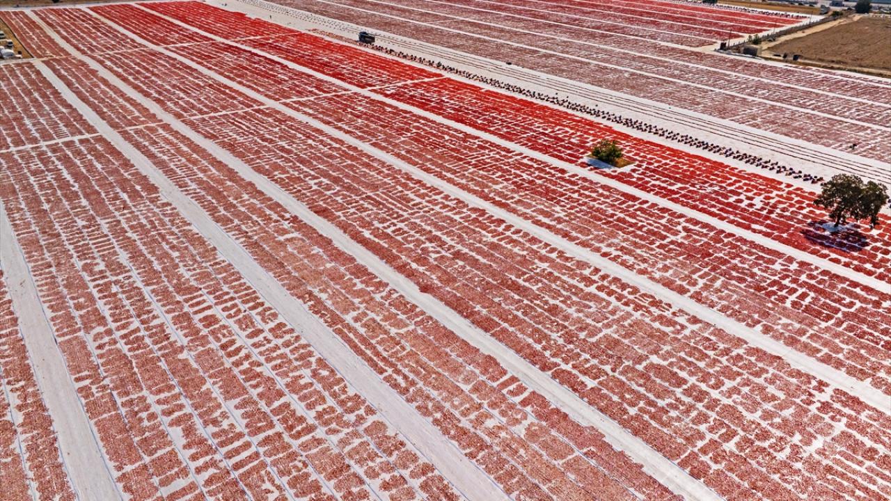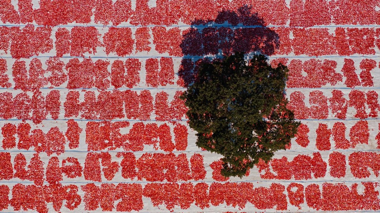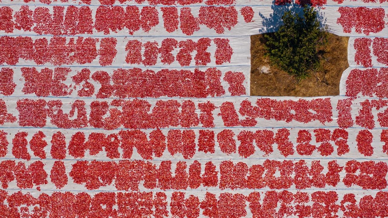 Tarım işçileri tarafından ikiye bölünerek örtülerin üzerine sıralanan domatesler, müşteri talebine göre kükürtlü veya tuzlu olarak 1 hafta güneş altında bekletilerek kurutuluyor.