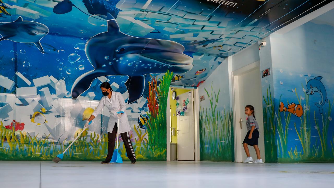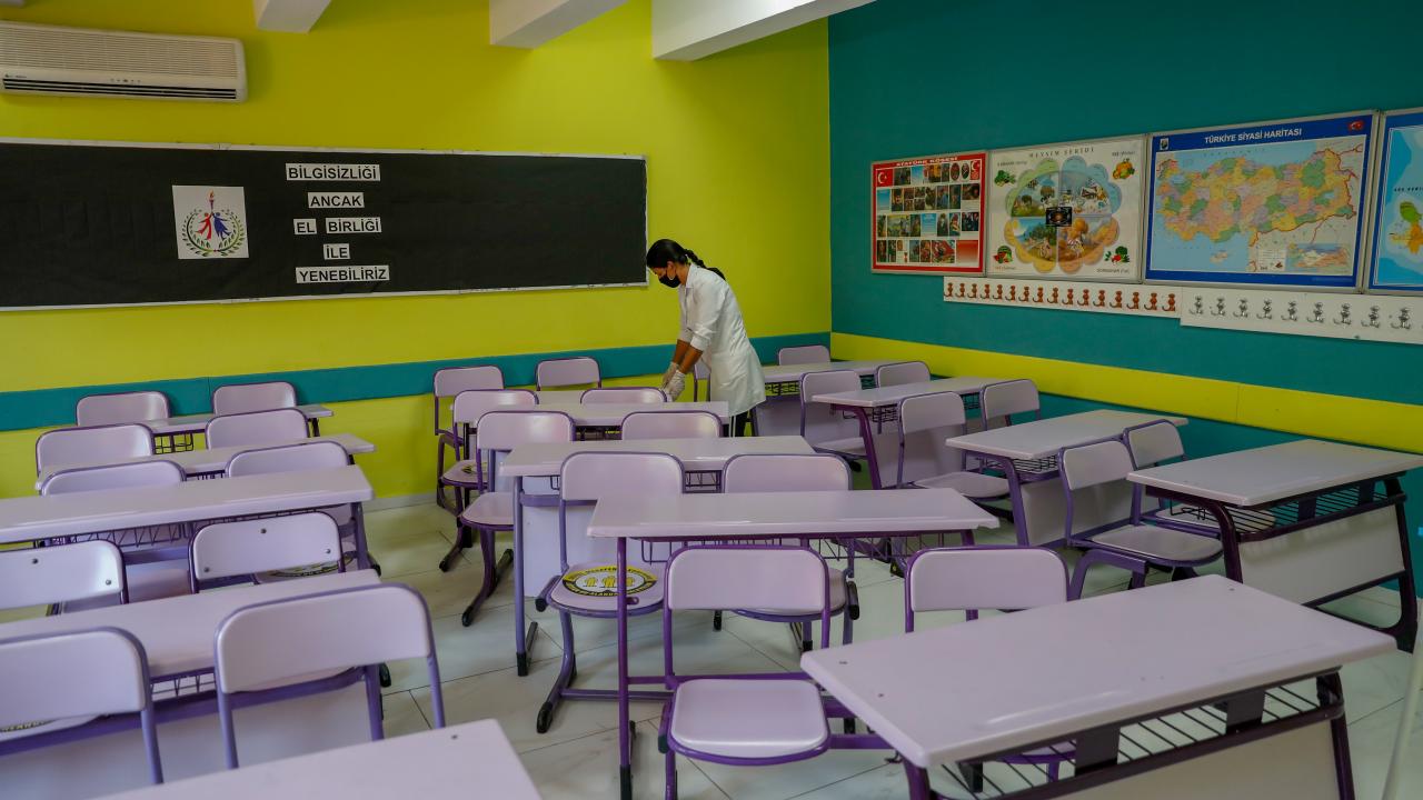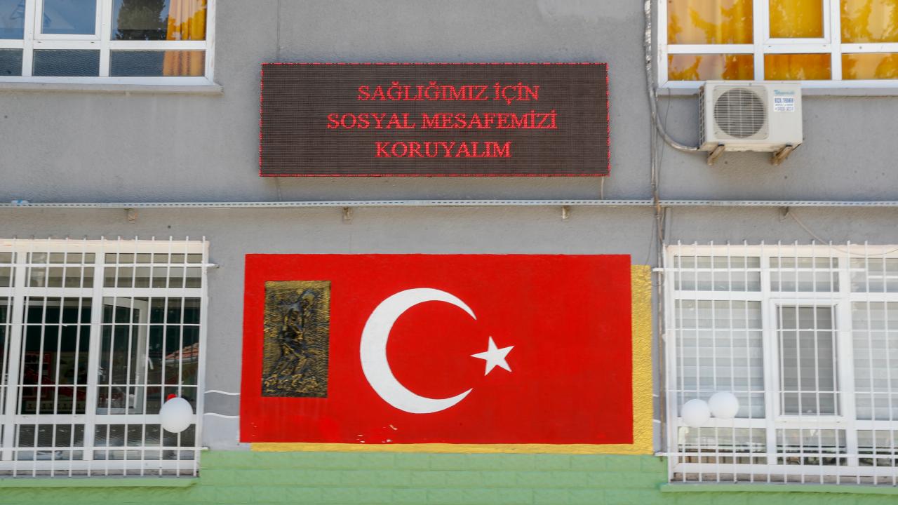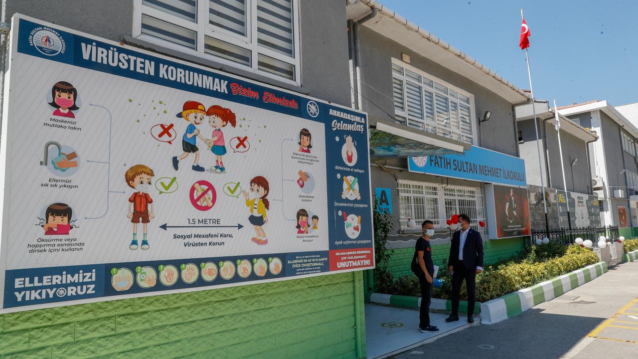 İzmir'de, 6 Eylül'de yüz yüze eğitimin başlayacağı tüm okullar, yeni tip koronavirüse (Covid-19) karşı alınan tedbirlerle eğitime hazır hale getirildi.