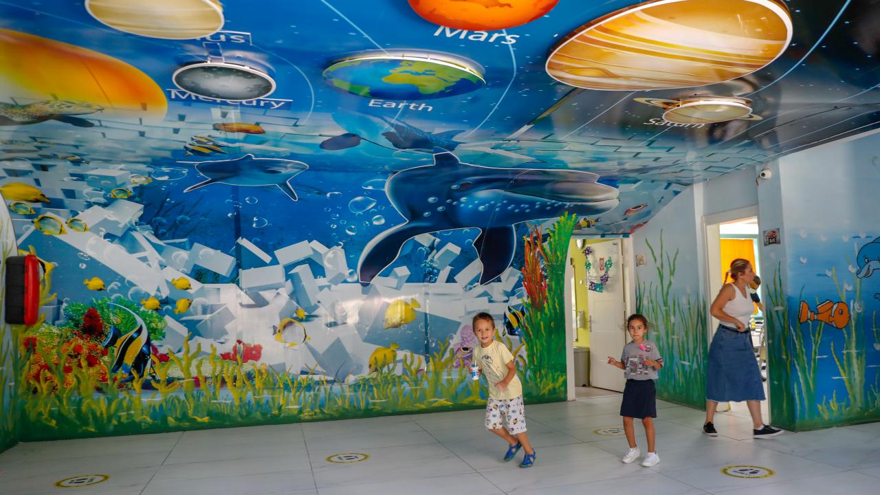 Sınıfların yanı sıra bahçe ve koridorlar gibi okullardaki diğer alanlara sosyal mesafenin korunması gerektiğini hatırlatan etiketler yerleştirildi.