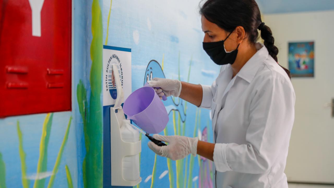 Öğrenci ve öğretmenlerin ellerini dezenfekte edebilmesi için geçen yıl olduğu gibi okul binası girişinde dezenfektan platformu yer alıyor.