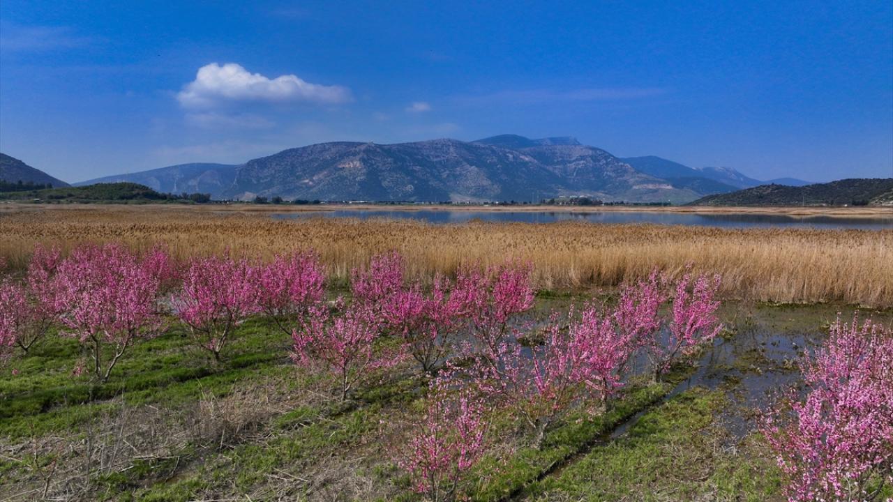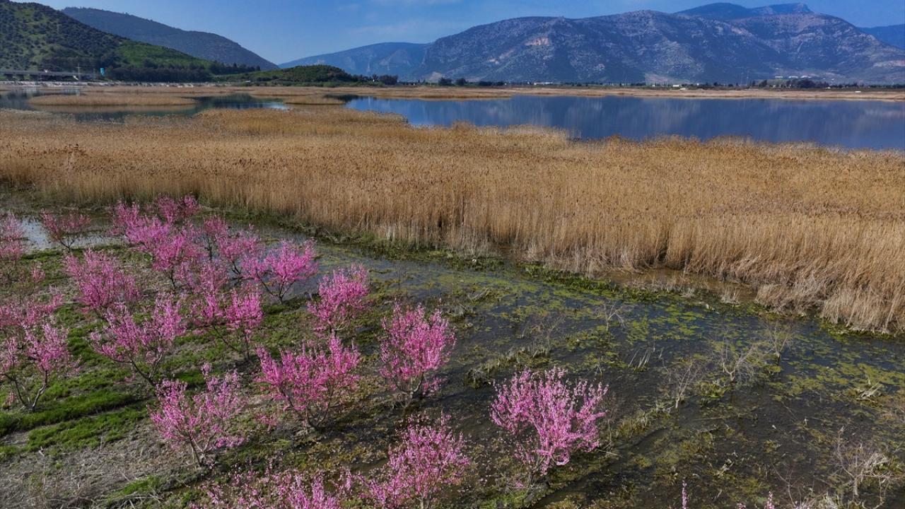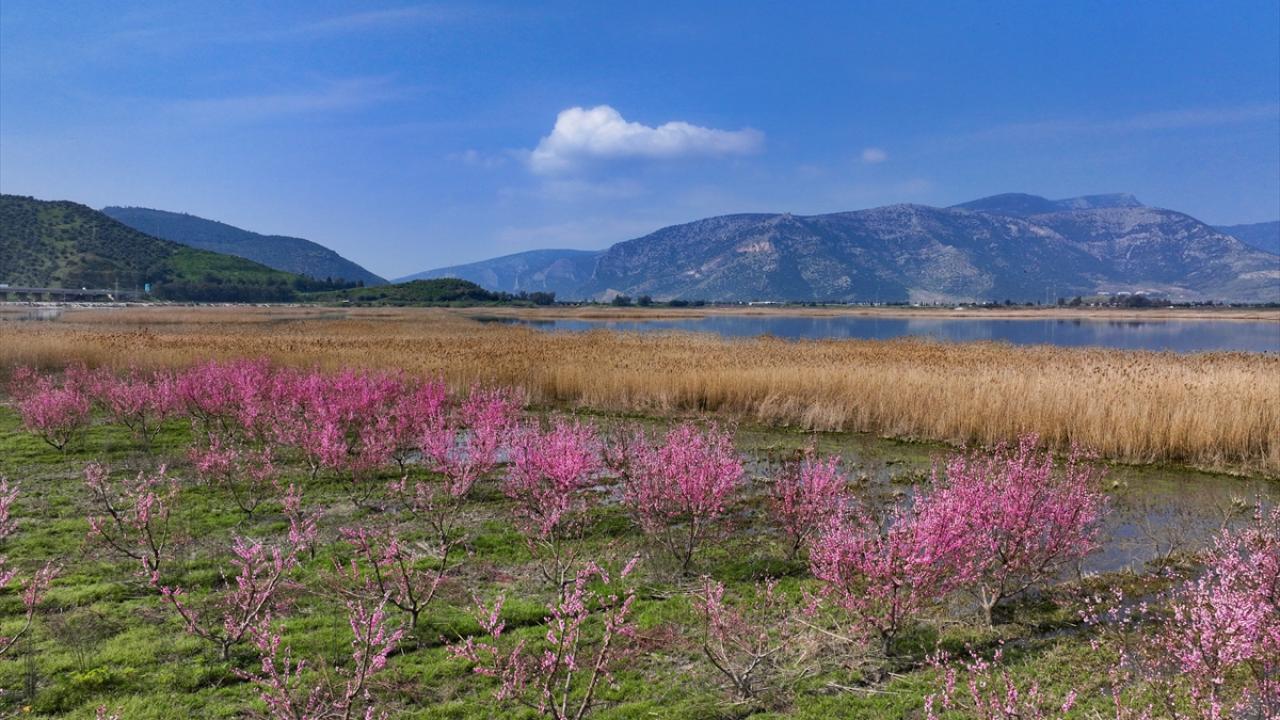 Çiçek açan ağaçlar, pembe tonların hakim olduğu renkli görüntü oluşturdu.