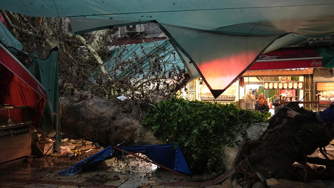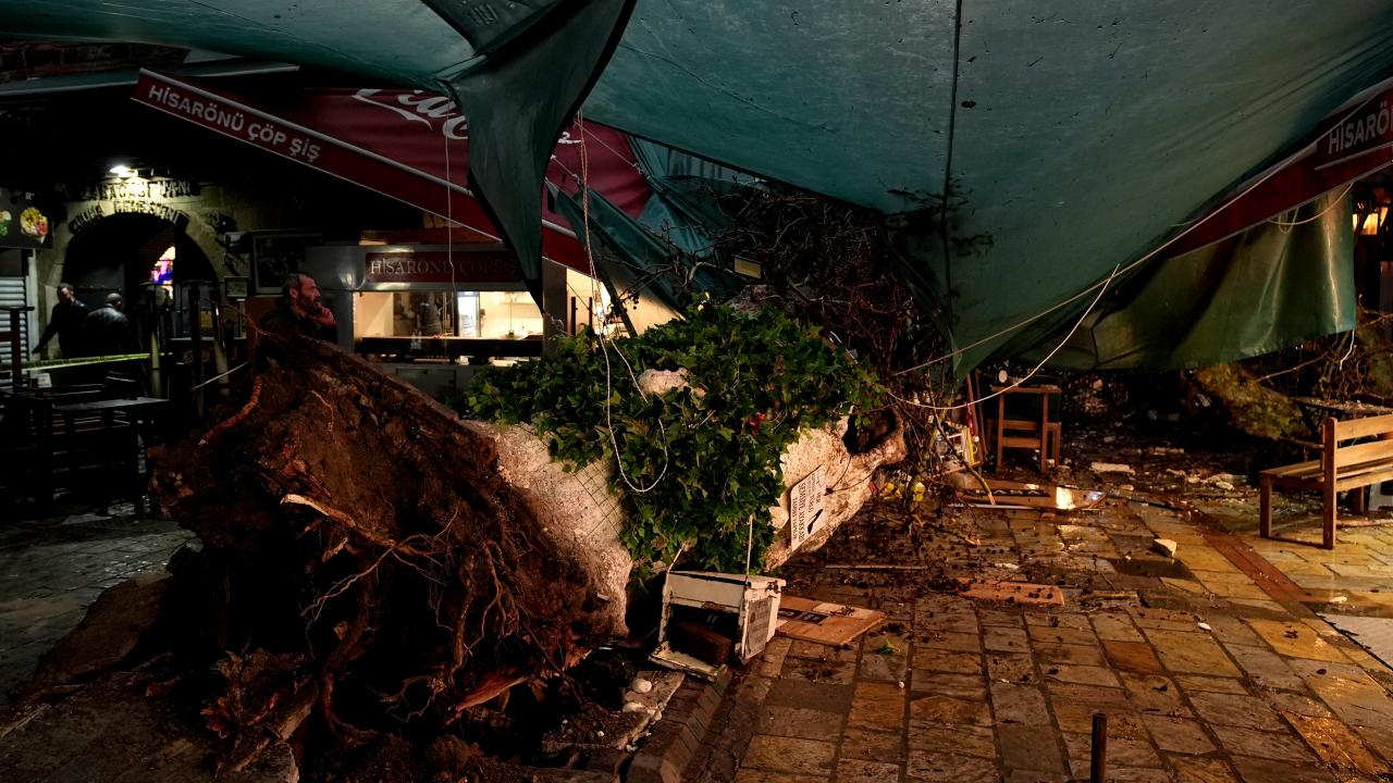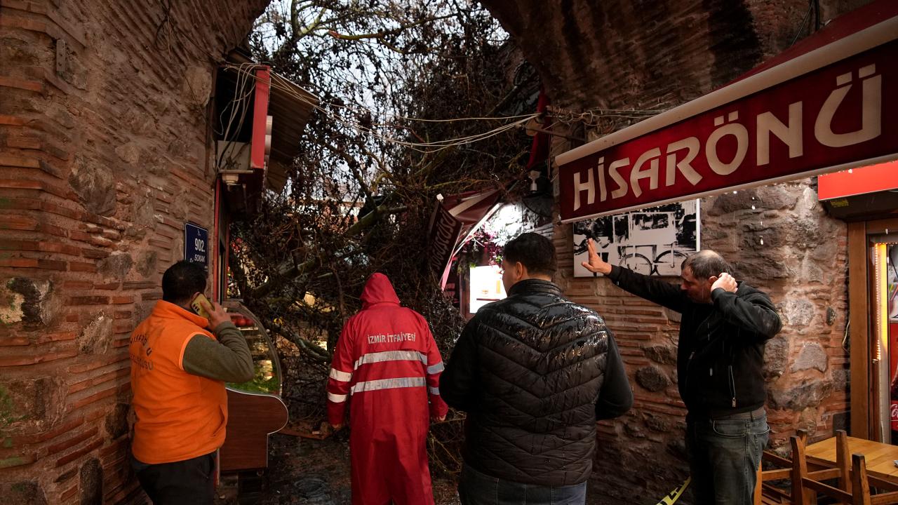Konak ilçesinde bulunan Hisar Camisi önündeki anıt çınar ağacı henüz belirlenemeyen nedenle bazı iş yerlerinin üzerine devrildi.