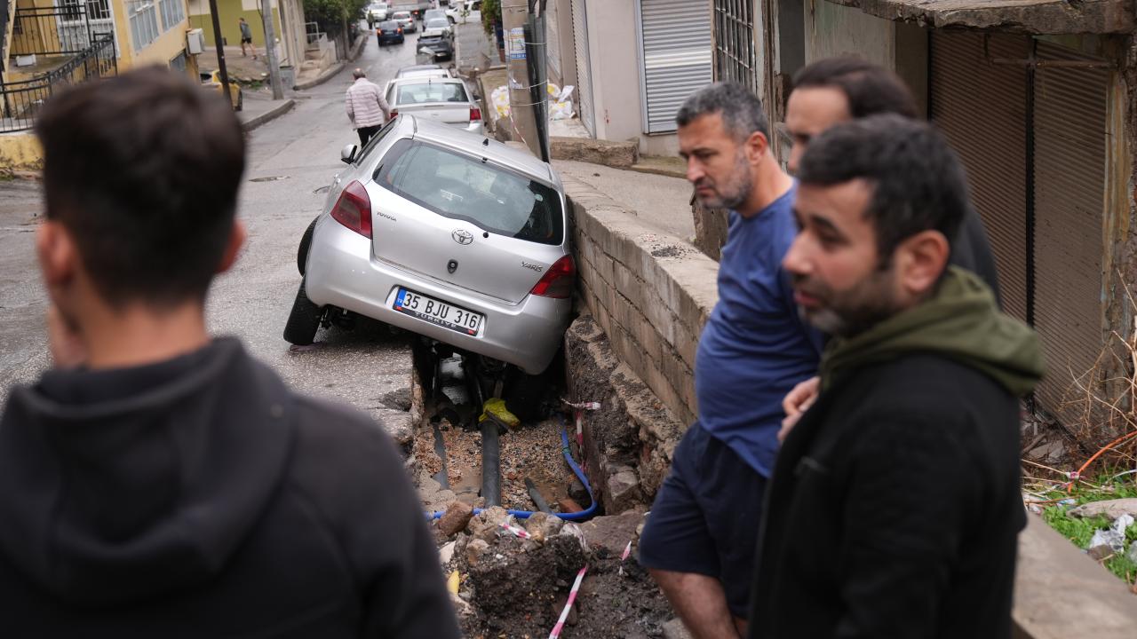 Bayraklı ilçesi 1639 Sokak`ta, kazı yapılan yol için dökülen mıcırların yağış nedeniyle taşınması sonucu çukur oluştu.
