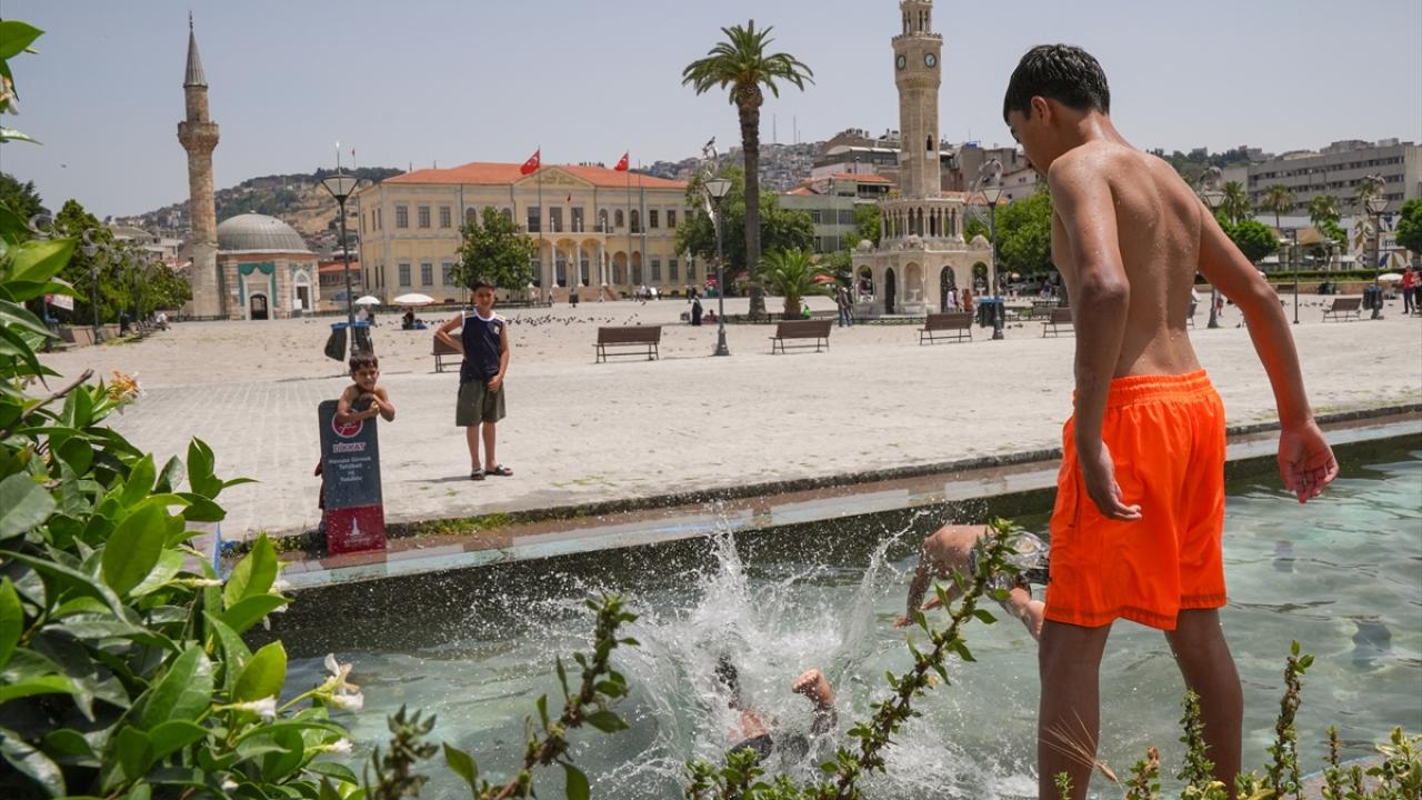 Sıcaktan bunalan bazı çocuklar, yasak olmasına rağmen Konak Atatürk Meydanı`ndaki süs havuzunda yüzerek serinledi.