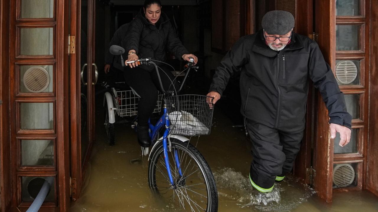 Alsancak İskelesi karşısındaki İskele Apartmanı`na gelen bir hasta bakıcı, sudan geçebilmek için çareyi sepetli bisiklette buldu. Apartman görevlisi ve bina sakinleri, hasta bakıcı kadını sepetli bisikletle merdivenlere kadar taşıdı.