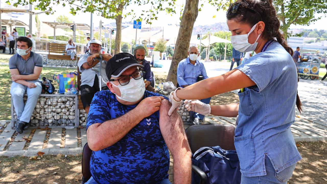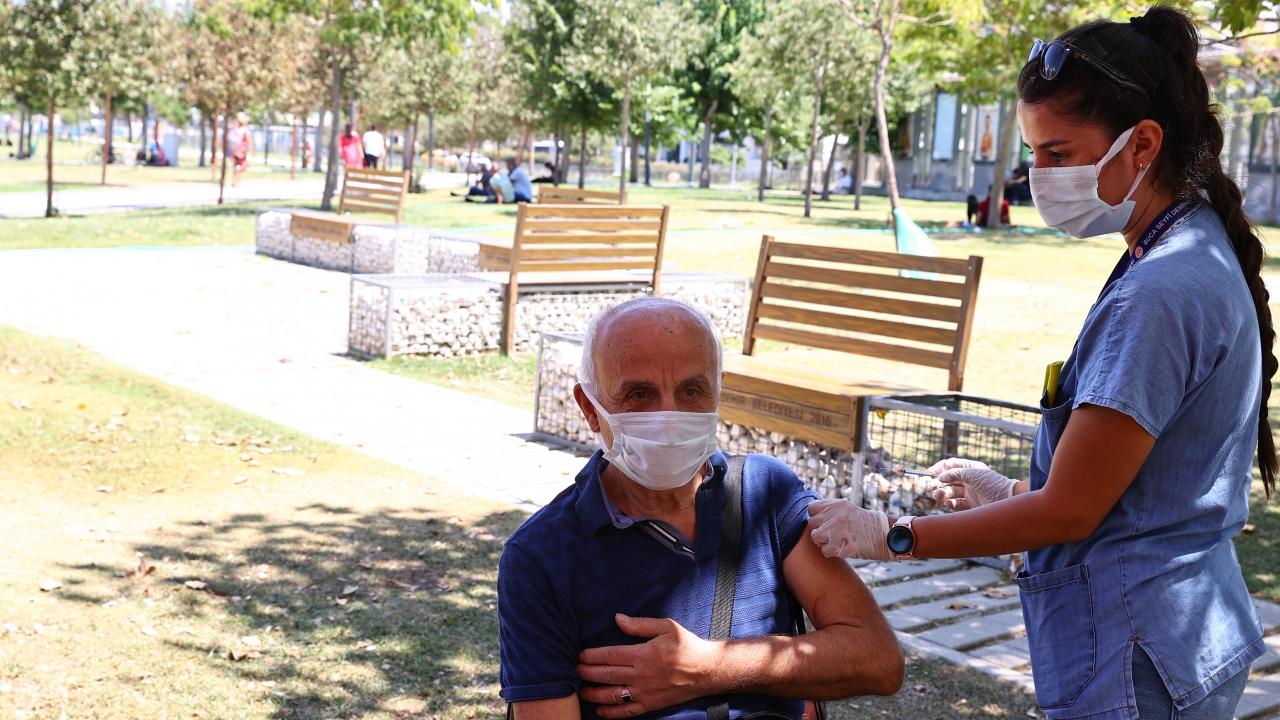 Aşılanmanın hızlı ilerlediği kentlerden İzmir'de meydanlarda kurulan aşılama noktalarında vatandaşlar, hem bayramlaşma hem aşılarını olma imkanı buluyor.