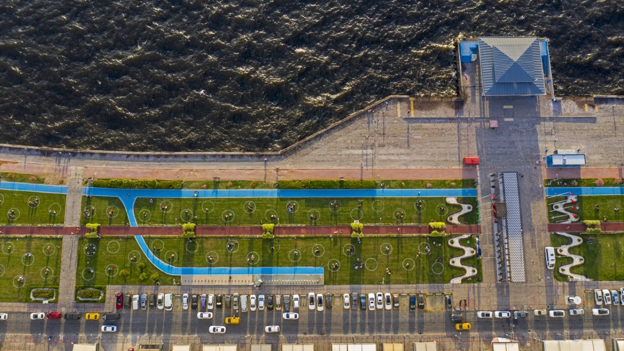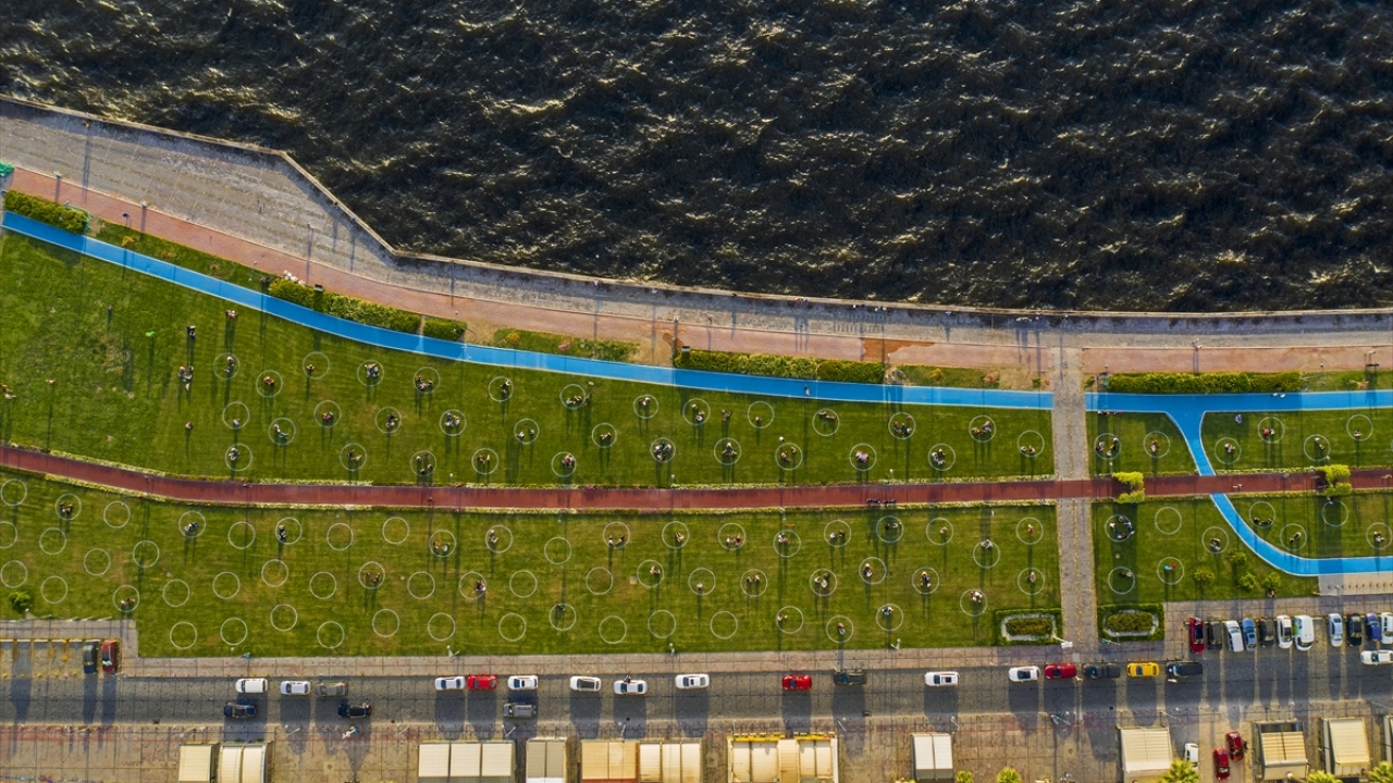 İzmir'de, yeni tip koronavirüsle (Covid-19) mücadele tedbirleri kapsamında sosyal mesafe kuralına uyulması için Kordon'da "çemberli sosyal mesafe" uygulaması başlatıldı.