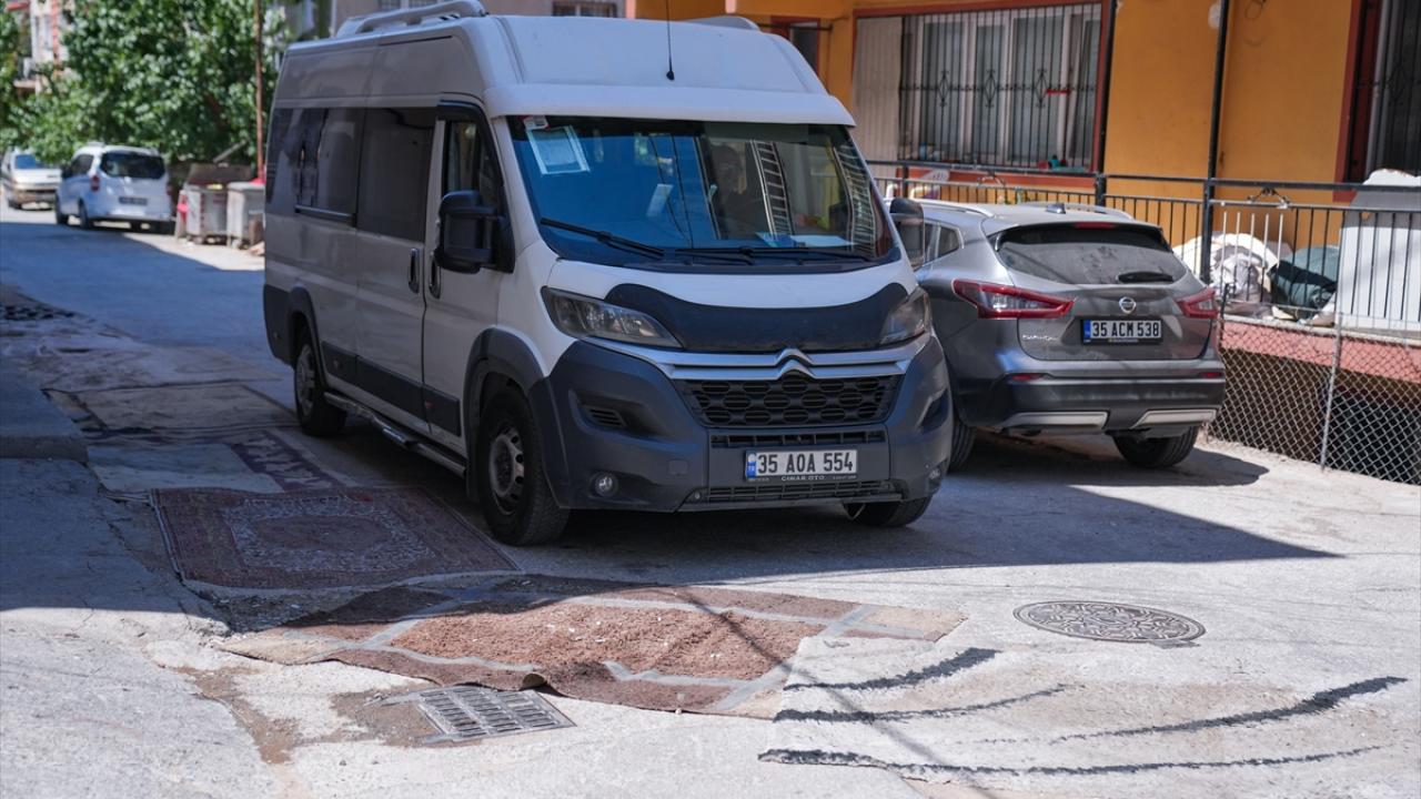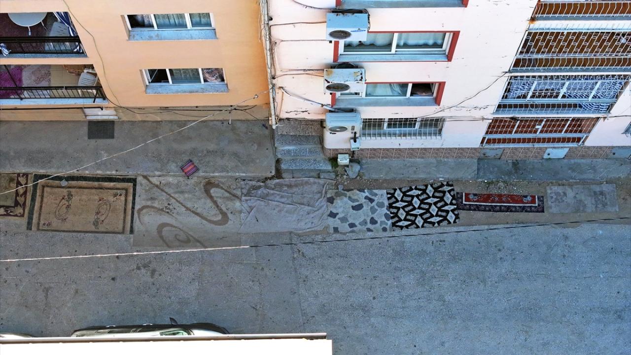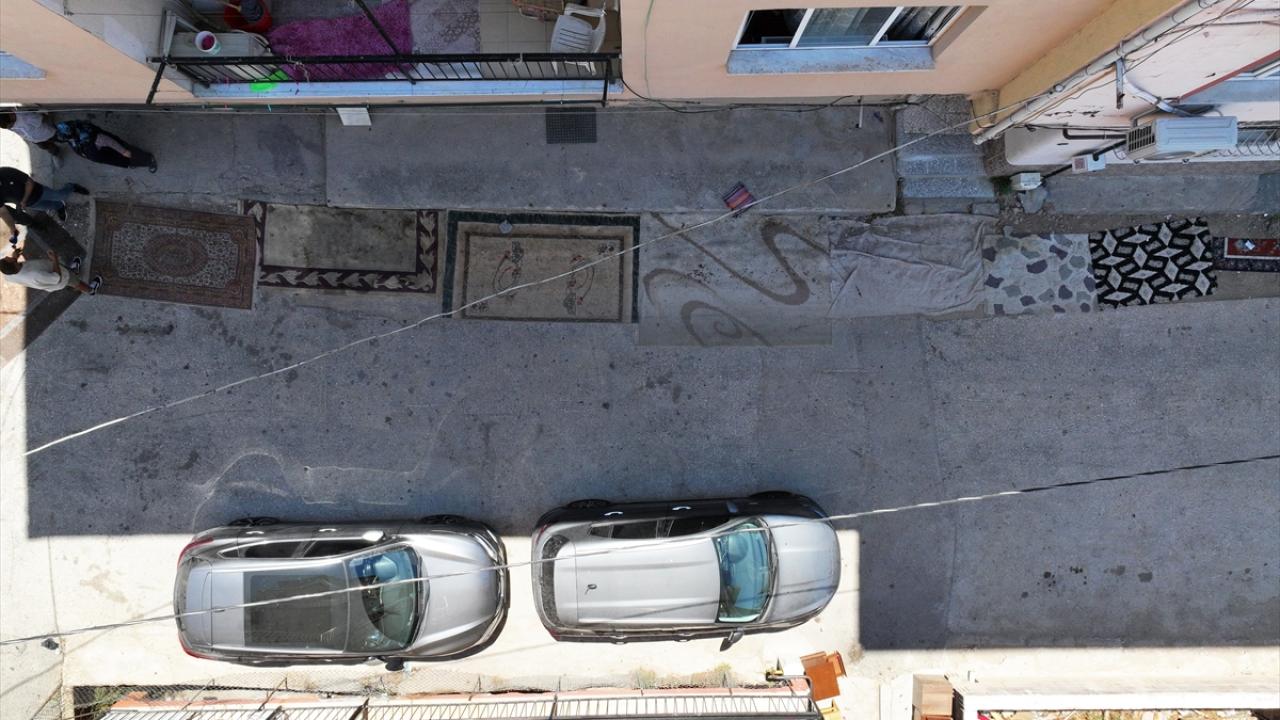 İzmir'in Bayraklı ilçesinde, altyapı çalışmaları için kazılan yolda gerekli çalışma yapılmadığı için tozdan etkilenen ve araçları zarar gören mahalle sakinleri, önlem amacıyla evlerindeki halıları kazı yapılan sokağa serdi.