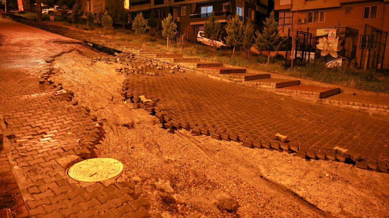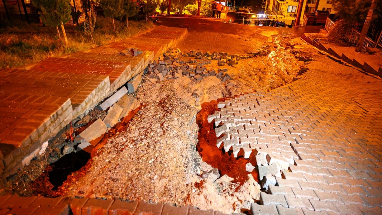 Küçük Çiğli Mahallesi`ndeki parke taşlı 8861 Sokak`ta yol, yağış nedeniyle çöktü.