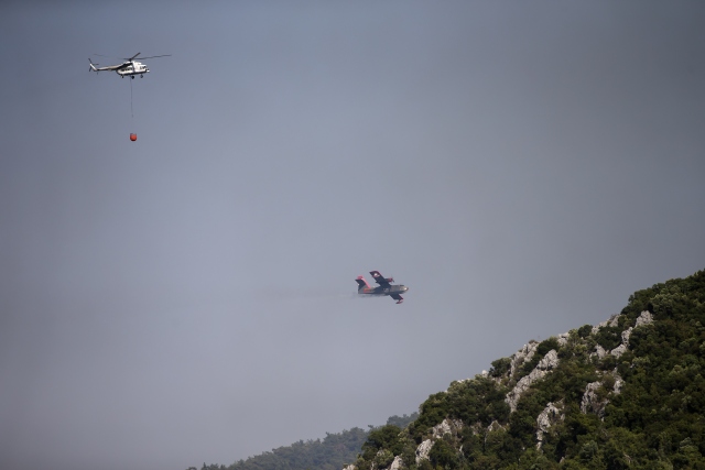 İzmir'in Menderes ilçesinde önceki gün makilik alanda başlayarak rüzgarın etkisiyle ormanlık alana yayılan yangını söndürme çalışmaları sürüyor. 800 hektarlık ağaçlık alanda etkili olan yangına hava unsurları da müdahale etti.