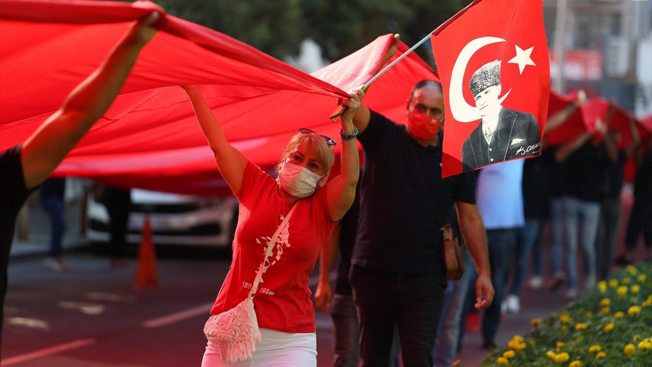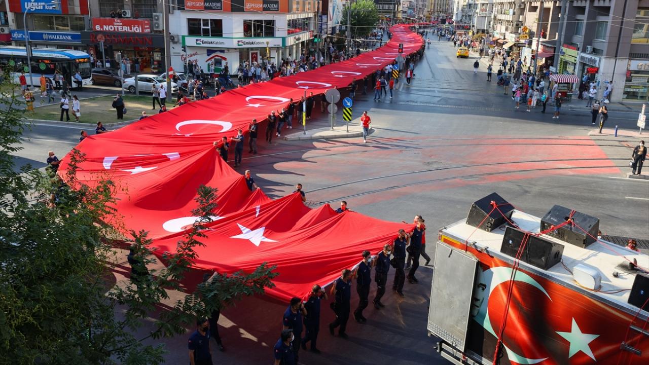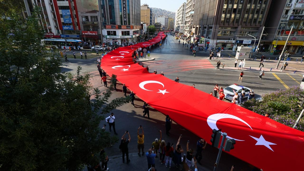 Türk ordusunun İzmir`e girerken kullandığı tarihi güzergah üzerinde düzenlenen yürüyüşte Gaziler, Anafartalar ve İkiçeşmelik caddelerini takip eden İzmirliler, 350 metre uzunluğundaki dev Türk bayrağını birlikte taşıdı.