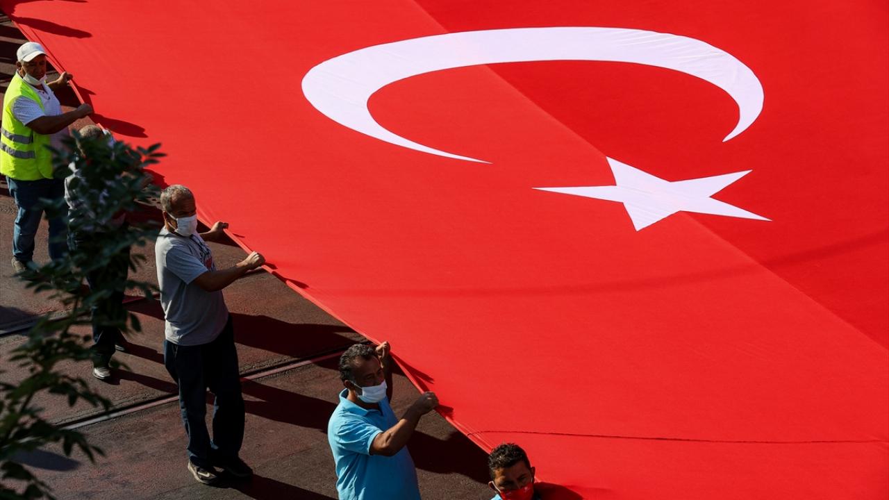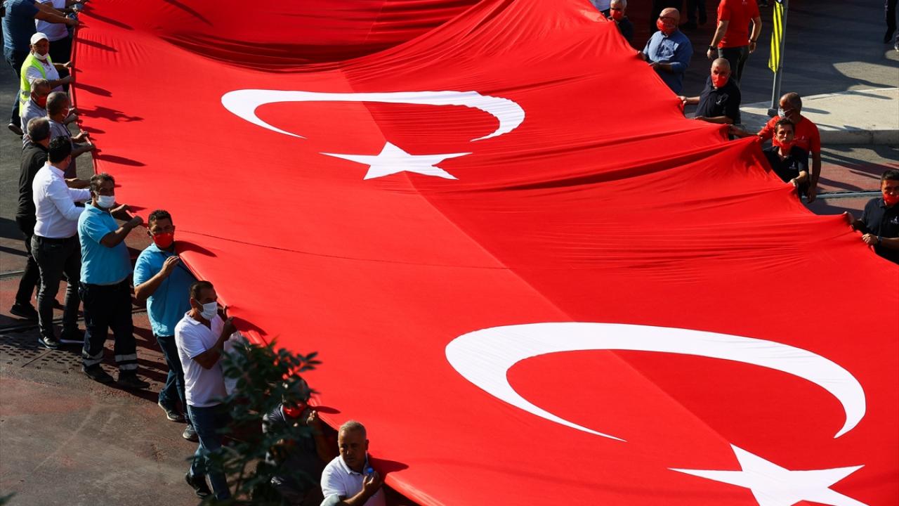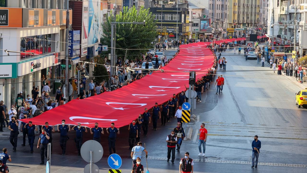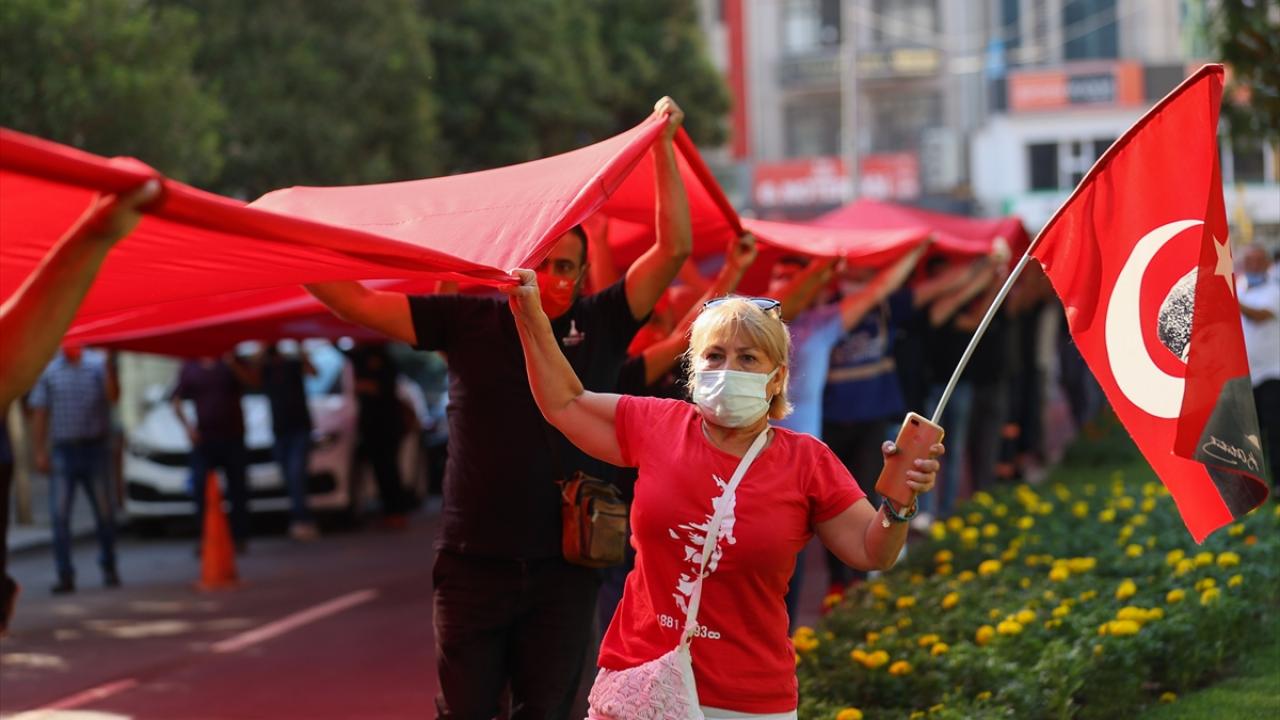 Türk ordusunun İzmir`e girerken kullandığı tarihi güzergah üzerinde düzenlenen yürüyüşte Gaziler, Anafartalar ve İkiçeşmelik caddelerini takip eden İzmirliler, 350 metre uzunluğundaki dev Türk bayrağını birlikte taşıdı.