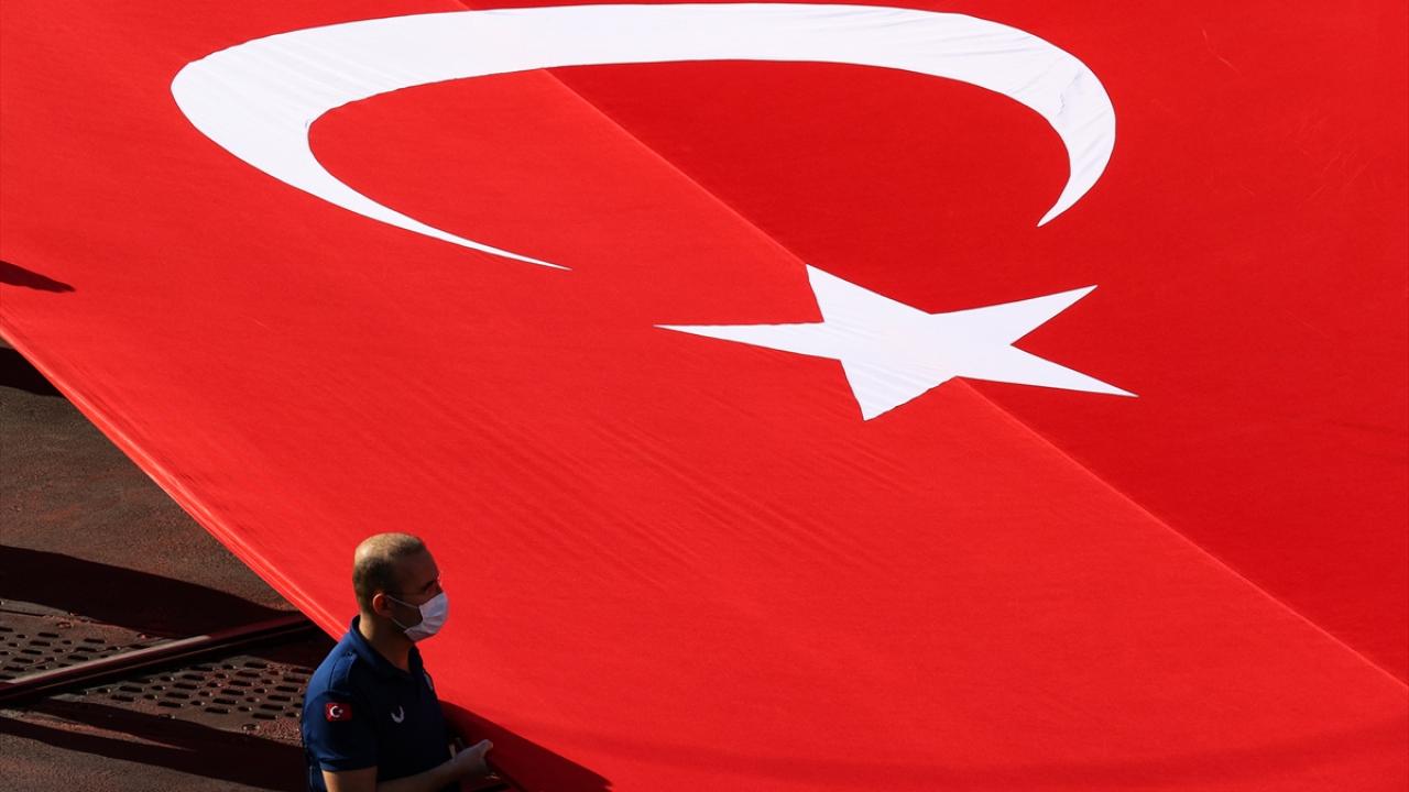 Ardından Türk bayrakları göndere çekilerek saygı duruşunda bulunulup İstiklal Marşı okundu.
