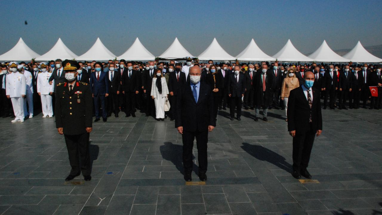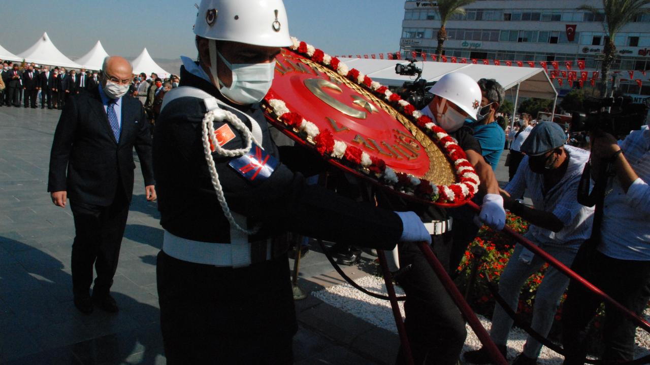 İzmir Valisi Yavuz Selim Köşger, Ege Ordusu Garnizon Komutanı Orgeneral Ali Sivri ve İzmir Büyükşehir Belediye Başkanı Tunç Soyer, çelenklerini Atatürk anıtına sundu.